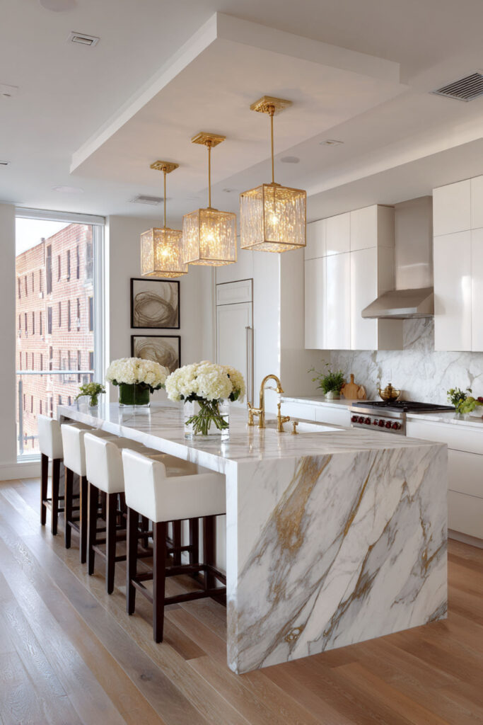 I really recommend making islands of different heights for visual interest. To finish the look, consider pendant lighting like this crystal pendant light that adds elegance and sparkle above each island. This approach prevents bottlenecks during meal prep while providing multiple work zones. It’s the kitchen equivalent of a two-car garage—luxurious but genuinely useful.