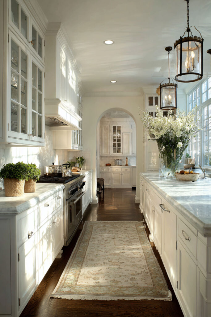 I really recommend this oil-rubbed bronze hardware that feels period-appropriate but works perfectly today. These kitchens feel rooted in history while functioning for contemporary life. The style works particularly well in older homes where it respects original architecture.