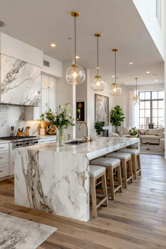 I really recommend this extended island design that seats 4 comfortably. Open plans require thoughtful storage since everything’s on display, but the connectivity makes every meal more social.