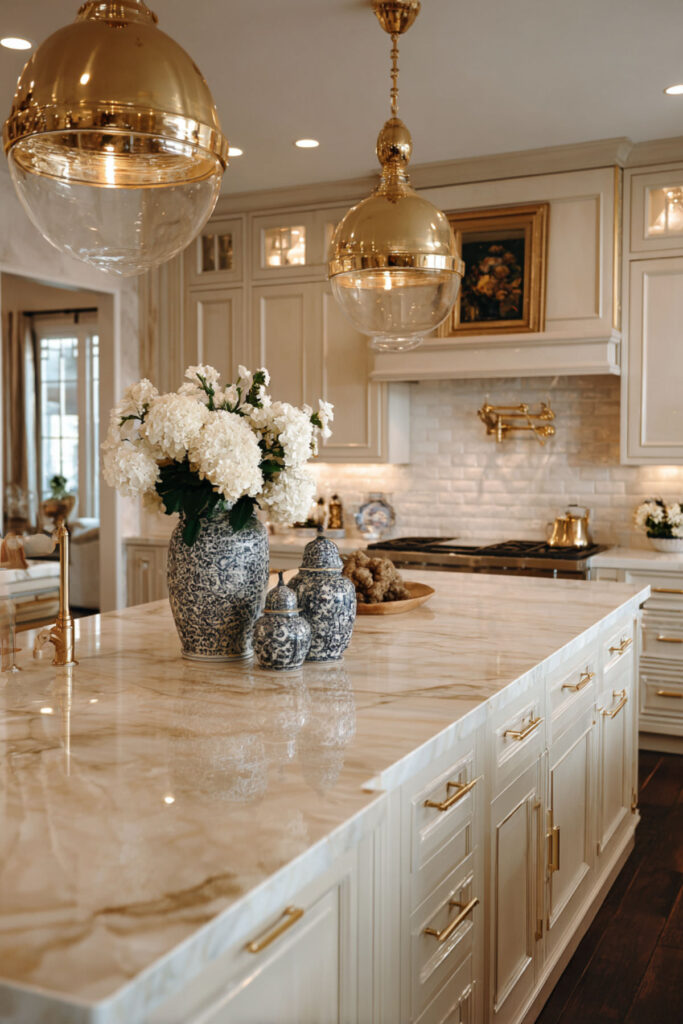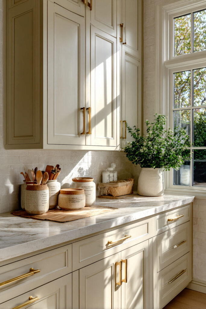 Beige and gold kitchen combinations add warmth without overwhelming busy mom brains. Beige cabinets with gold hardware creates subtle luxury that elevates daily life. The gold accents catch light and add joy during endless kitchen tasks. Choose brushed or antique gold that doesn’t show fingerprints as readily as polished.