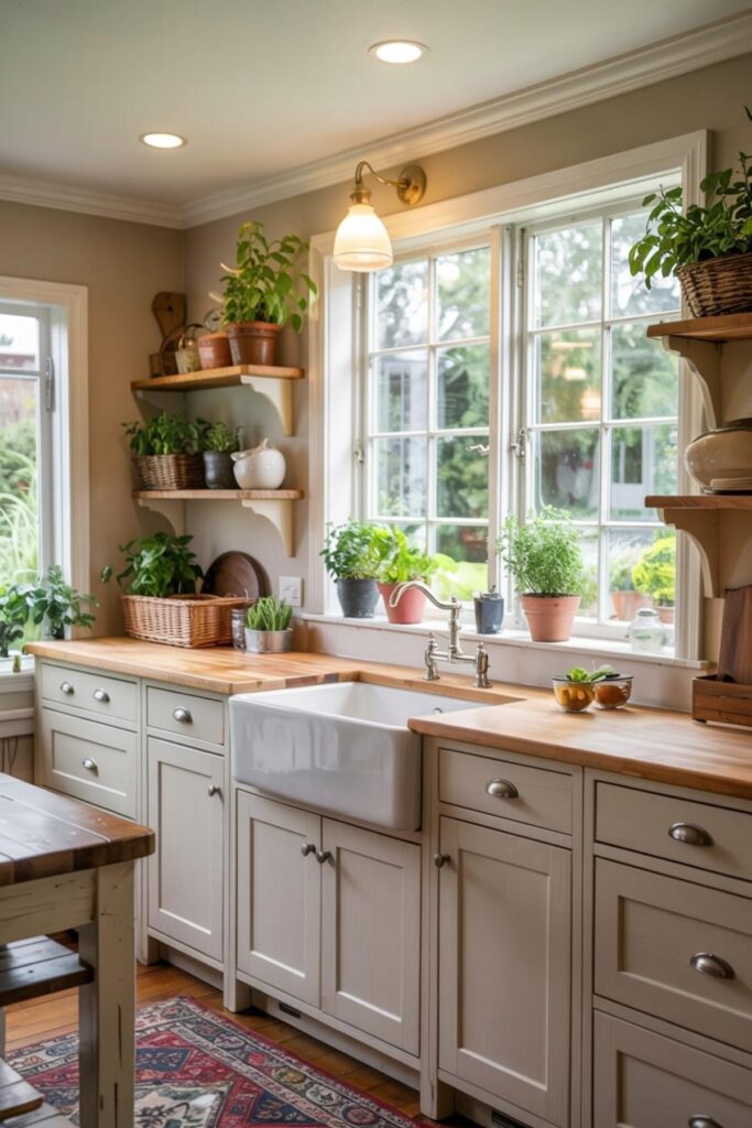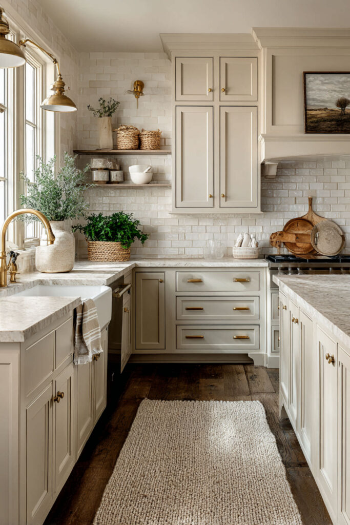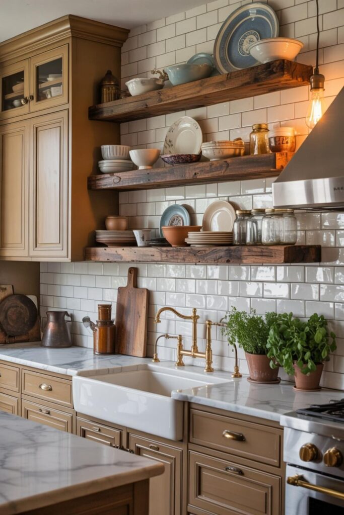 Add shiplap backsplash in beige for texture without maintenance worry. A rustic farmhouse apron-front sink completes the look, saying “family lives here” without apologizing for it. The farmhouse approach makes messes look intentional rather than chaotic.