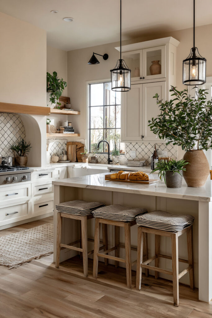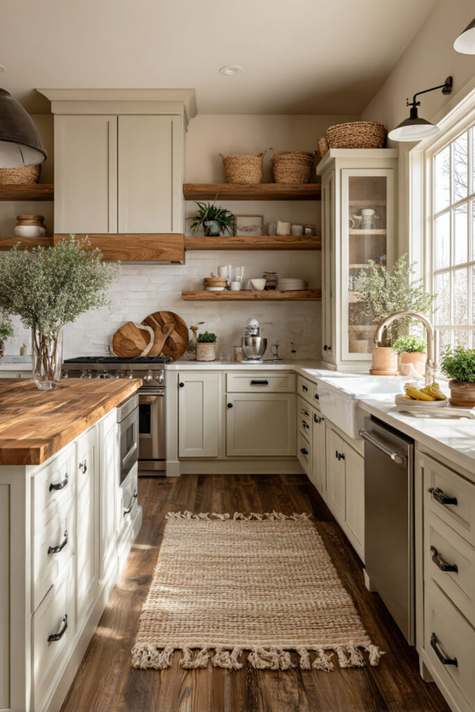 The wood adds organic warmth to beige’s neutrality. This approach makes the kitchen feel collected over time rather than decorated all at once. The rustic element gives permission for imperfection – crucial during these messy years.