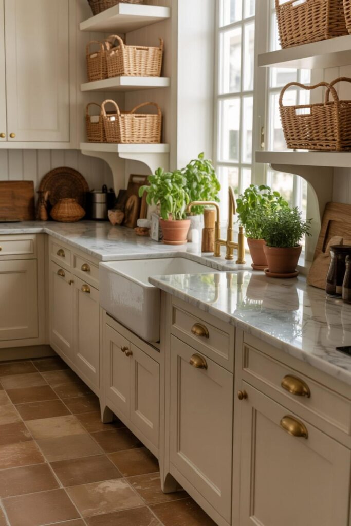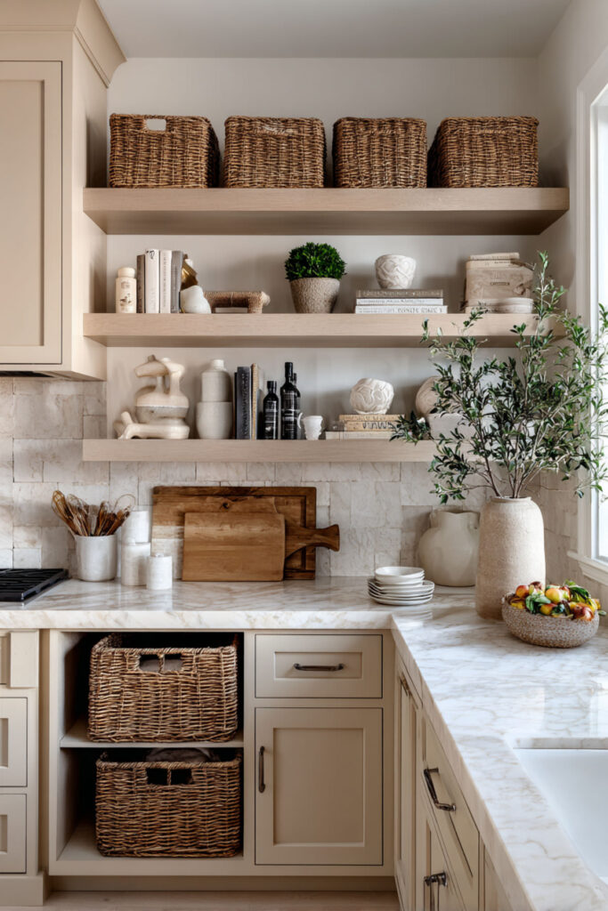 A neutral kitchen in beige tones supports organization that actually works with toddlers. Use matching beige baskets to corral the chaos attractively. Label with pictures for pre-readers who want independence. The neutral palette means organizational tools blend rather than add visual noise.