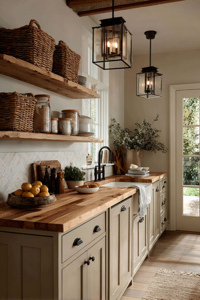 Add rustic wooden shelves to beige kitchens for storage that works with toddler life. Open shelving at adult height displays pretty things safe from grabbing hands. Lower shelves hold toddler-safe items in attractive baskets.