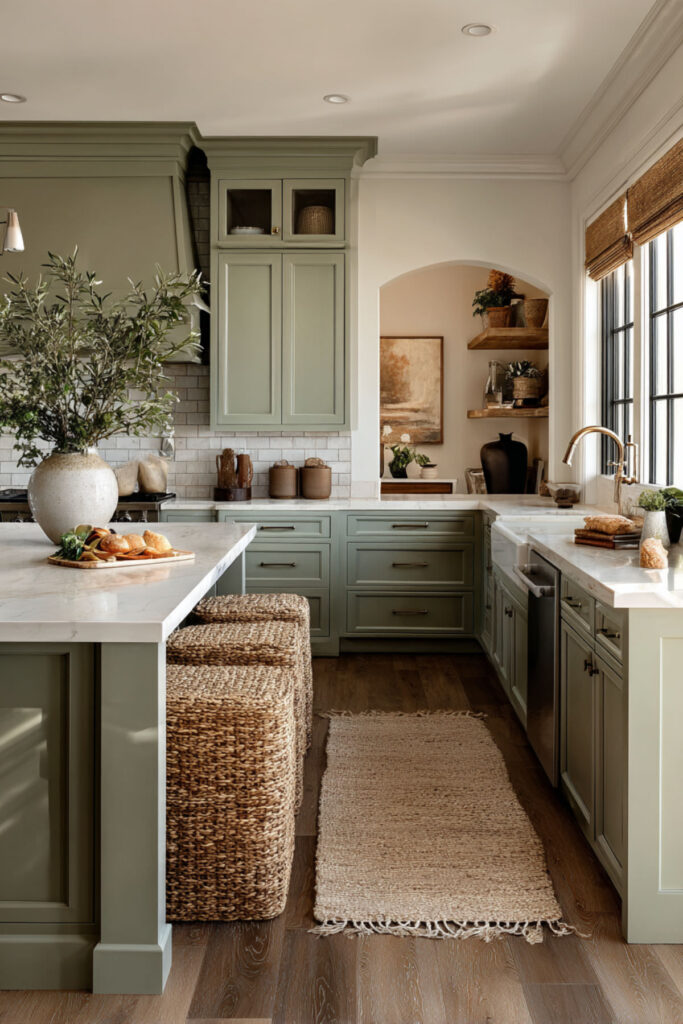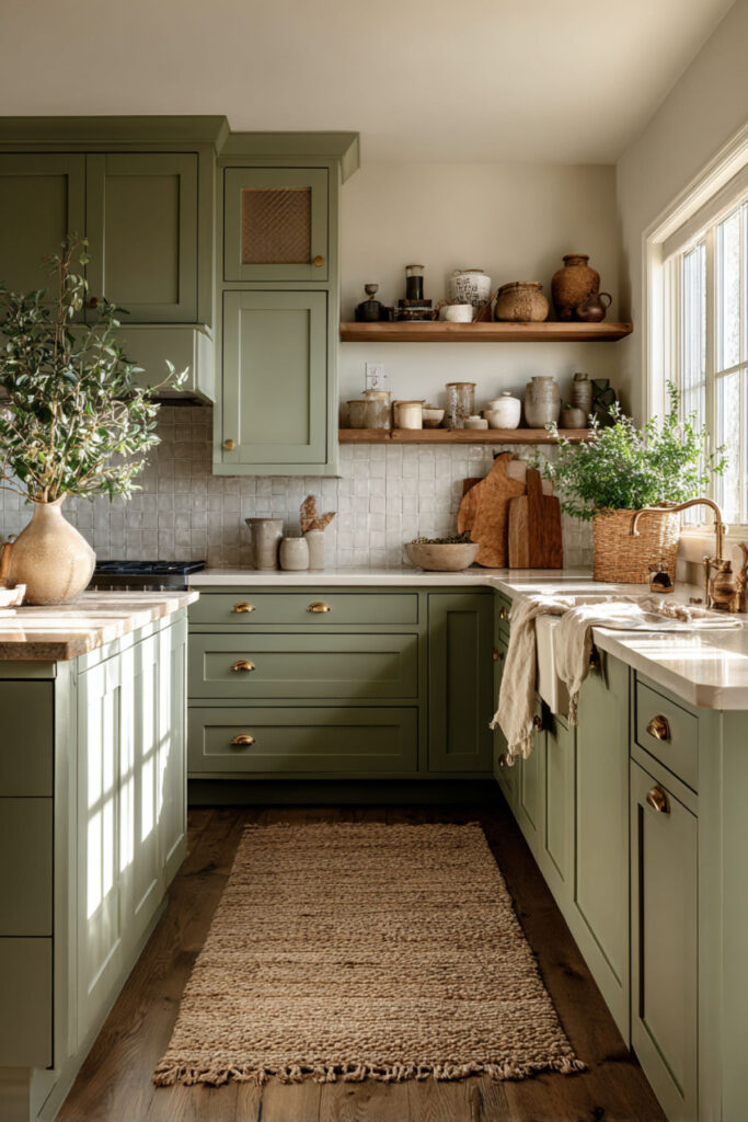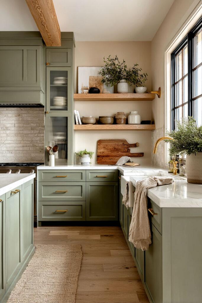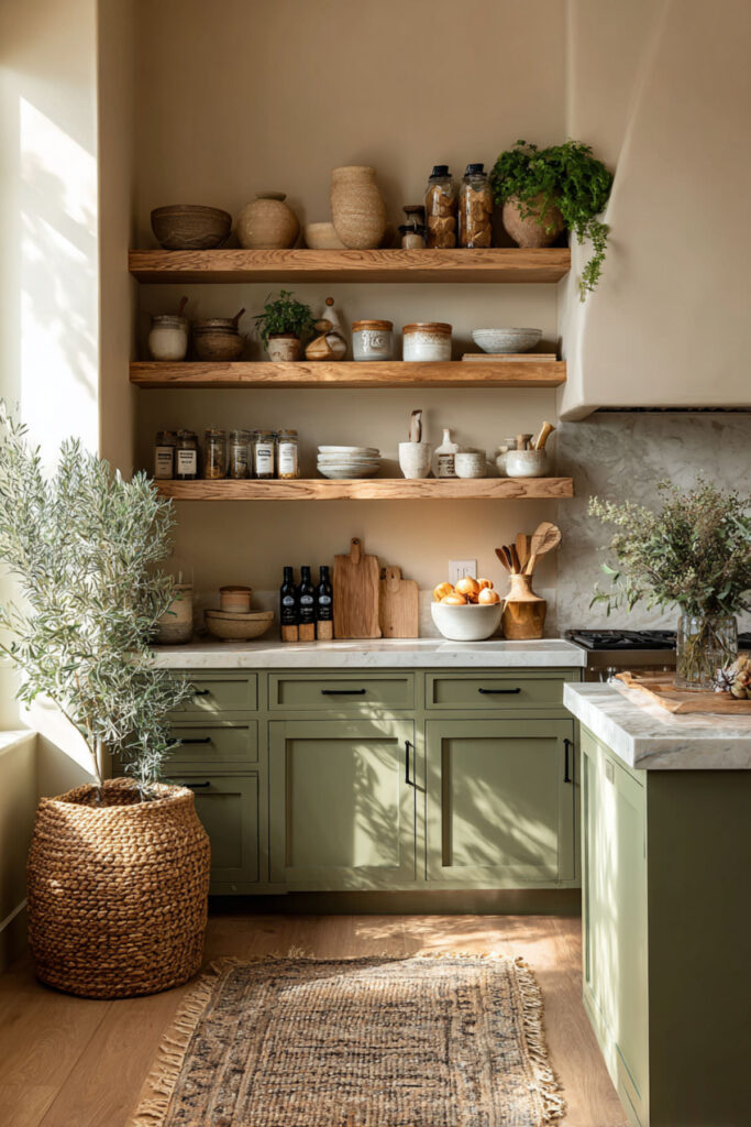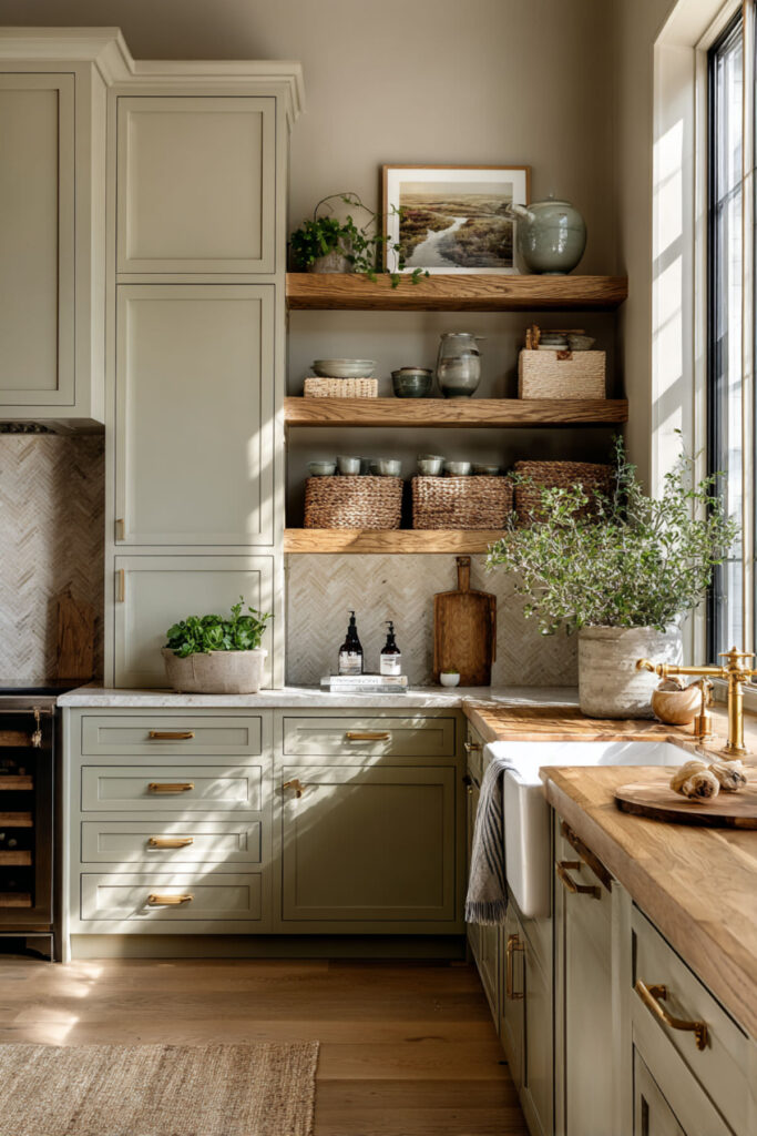I recommend thick floating shelves finished in a matte sage green, mounted on warm beige or sand-toned walls. Style them with a mix of functional and decorative items — the things your family actually uses every day. Cereal bowls, coffee mugs, a few glass canisters. It’s sage green kitchen aesthetic meets real life, and it makes the kitchen feel personal and curated rather than catalog-perfect.