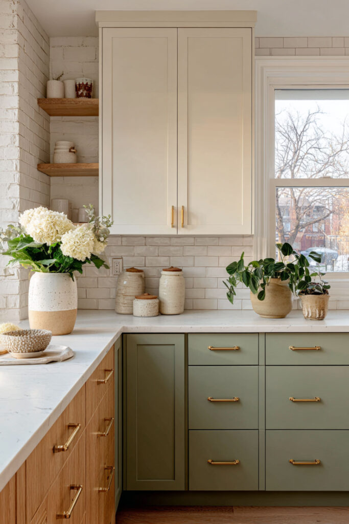 Two-tone cabinets are one of the smartest moves in kitchen design right now, and this particular split — warm beige on top, sage green on the bottom — feels incredibly balanced. The lighter beige uppers keep the kitchen bright and open (crucial in family homes where you need to see what’s happening), while the sage lowers ground the room with color and weight.