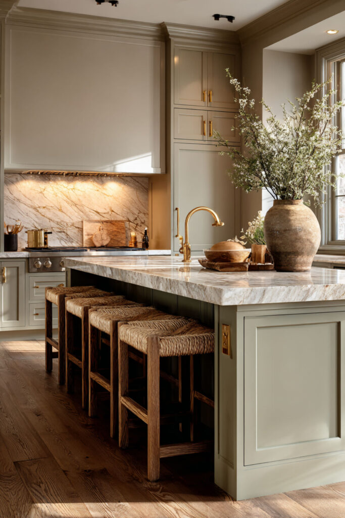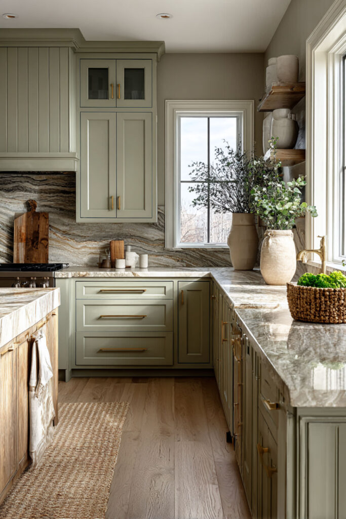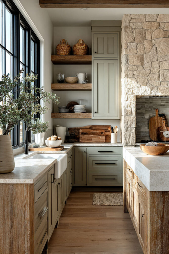 Sage green and natural wood are one of those pairings that immediately makes a kitchen feel warmer and more human. The wood grain brings texture and warmth that play off sage’s cooler tones, and when you add a beige stone island — something in a honed limestone or sandy quartz — the whole palette comes together in this earthy, grounded way.