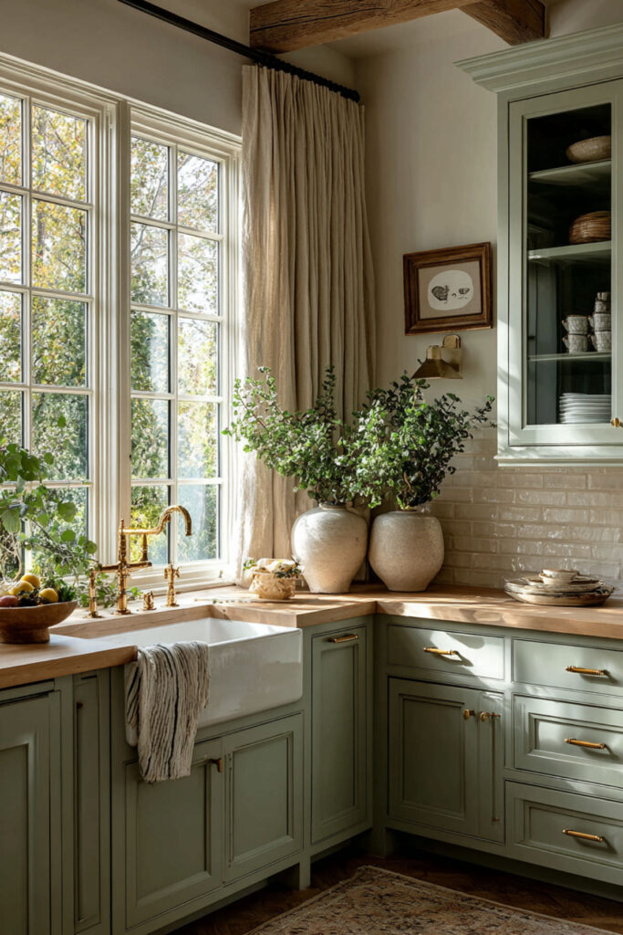 I recommend washed linen curtains in a warm oat or wheat tone, hung just above the window frame. Against sage green cabinetry, the beige fabric filters morning light into this gorgeous warm glow. It’s the kind of detail that makes your first cup of coffee feel like a tiny luxury — even when there’s a kid asking for cereal behind you. A soft sage kitchen with linen accents is the definition of calm done right.