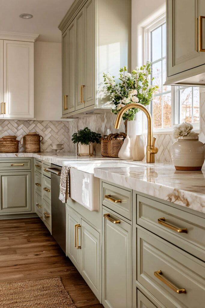 I strongly recommend cream upper cabinets with sage green lowers, unlacquered brass cup pulls, and a warm marble countertop. A cream and sage kitchen with brass accents looks expensive but doesn’t have to be — brass hardware is an affordable swap that transforms the whole room. Over time, the brass develops a patina that makes everything feel more personal. It’s a sage home aesthetic that ages beautifully.