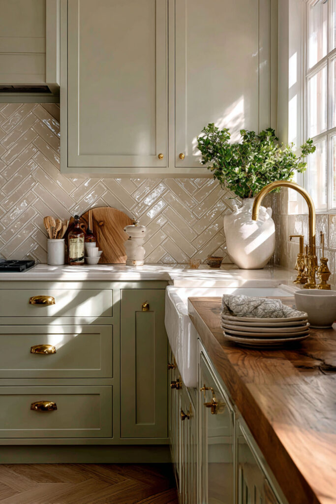 I came across this trending combination and I think it’s one of the prettiest neutral backsplash ideas for a sage green kitchen. Instead of classic white subway tile, try a warm beige or sand-toned tile. The slight warmth in the beige tile creates a softer transition between the sage cabinets and the countertop, and the whole wall feels cozier and more intentional.