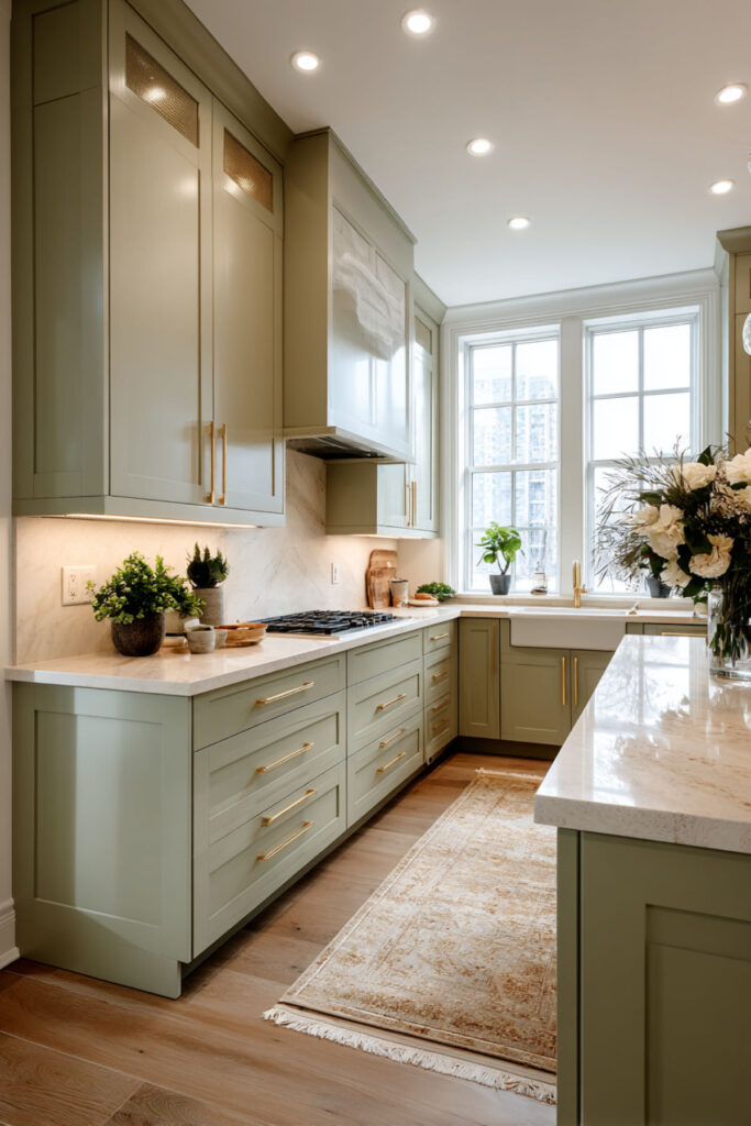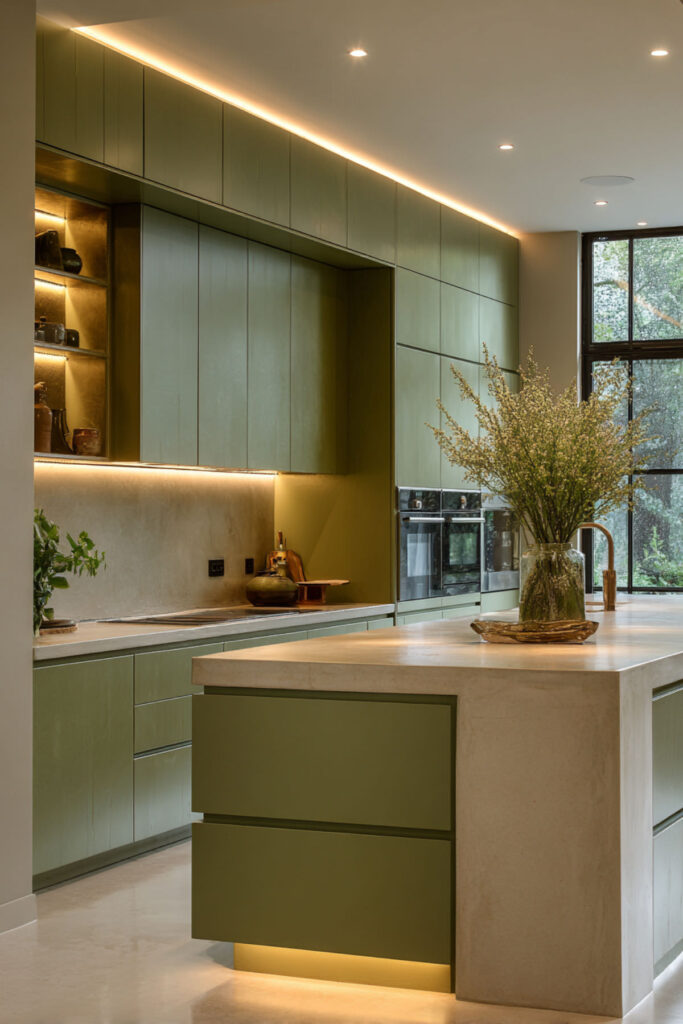 Sage doesn’t have to mean farmhouse or traditional. A modern sage green kitchen with flat-front cabinets and beige concrete countertops looks clean, current, and surprisingly warm. The concrete adds an industrial-modern edge that keeps the sage from feeling too soft, and the beige tone in the concrete prevents the room from going cold.
