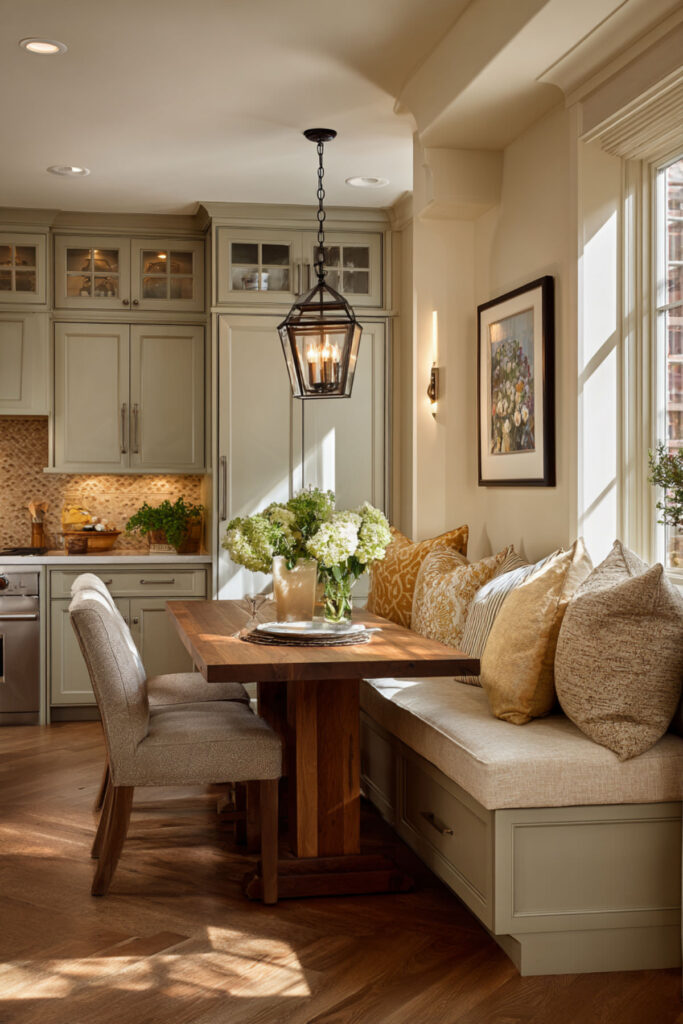 For moms who want the kitchen to be more than a cooking space, adding a built-in dining nook in the sage and beige palette extends the room’s warmth into a real gathering spot. A banquette upholstered in warm beige linen tucked against a sage green wall — with a simple wood table and mismatched chairs — creates a cozy corner where the whole family naturally lands.