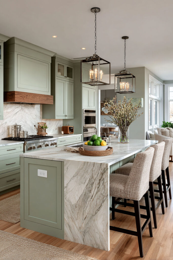 I recommend a substantial sage green painted island with a warm butcher block or beige quartz countertop, surrounded by beige or cream perimeter cabinets. Add three or four comfortable counter stools and a pendant light. The island becomes the room’s gathering point — breakfast, homework, meal prep, conversations. It’s sage green kitchen decor through one high-impact piece.