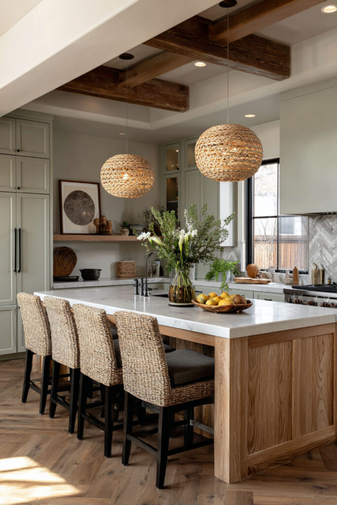 Lighting changes everything, and woven pendant lights in a warm beige or natural rattan tone are one of the most beautiful finishing touches for a sage and wood kitchen. They add organic texture overhead, cast a warm glow, and tie the beige into the upper part of the room — which keeps the palette feeling balanced from floor to ceiling.