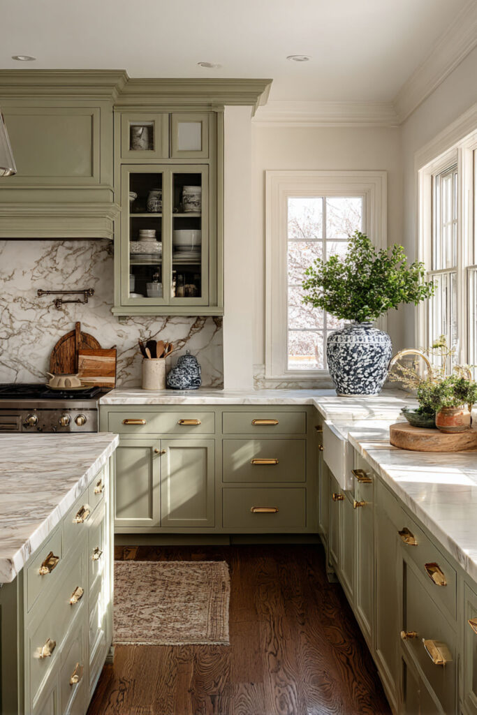 Sage Green and Cream Kitchen With Brass Hardware