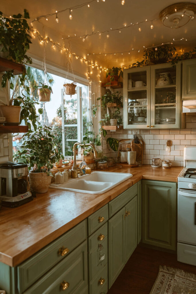There’s a house in my neighborhood — the one on the corner with the big front porch — where I once dropped off a casserole and accidentally stayed for two hours. The kitchen was the reason. Soft sage green cabinets, warm beige walls, a thick butcher block island with three mismatched stools, and sunlight coming through linen curtains that made everything glow. It wasn’t fancy. It wasn’t Pinterest-perfect. But it was the kind of room where you could feel yourself exhale. The kids were doing homework at the counter, there was something simmering on the stove, and nobody was in a rush. That’s the kitchen.