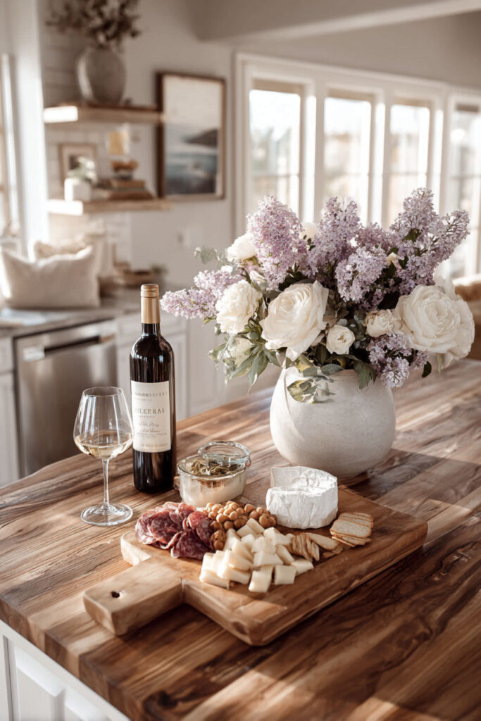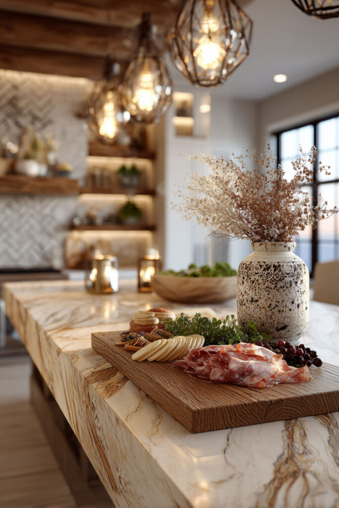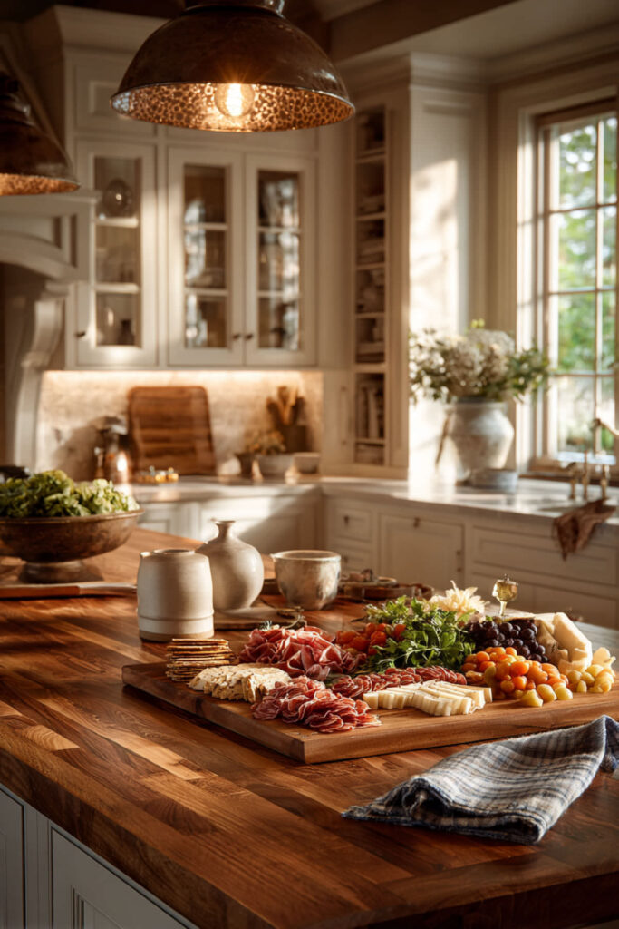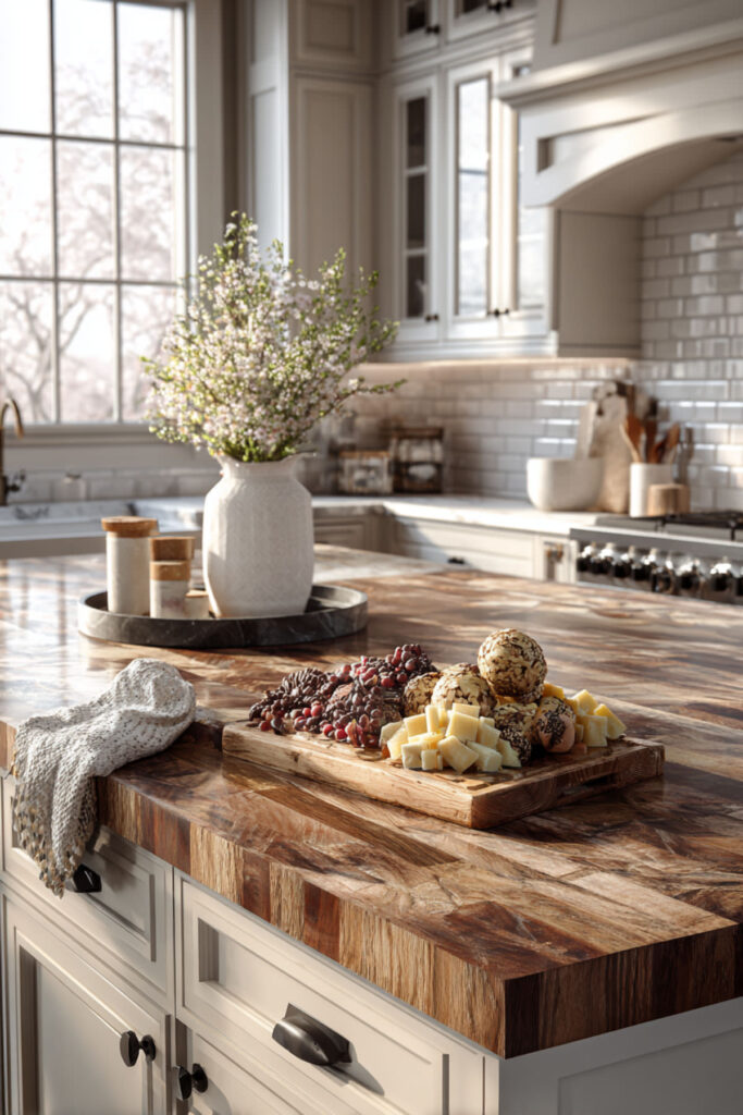 Here’s the thing about styling a butcher block island — the wood itself is the decor. You don’t need much on top of it. A ceramic pitcher with wooden spoons. A small cutting board leaning against a backsplash. A bowl of lemons. That’s the entire vibe. Butcher block island decor works best when it’s functional and minimal, because the warmth and grain of the wood provides all the visual interest the surface needs. I recommend a simple round oak cutting board and a stoneware crock for utensils as your two island anchor pieces — they’re useful every day and they let the beauty of the butcher block show through. This is island decor that works because it doesn’t try to compete with the surface beneath it.