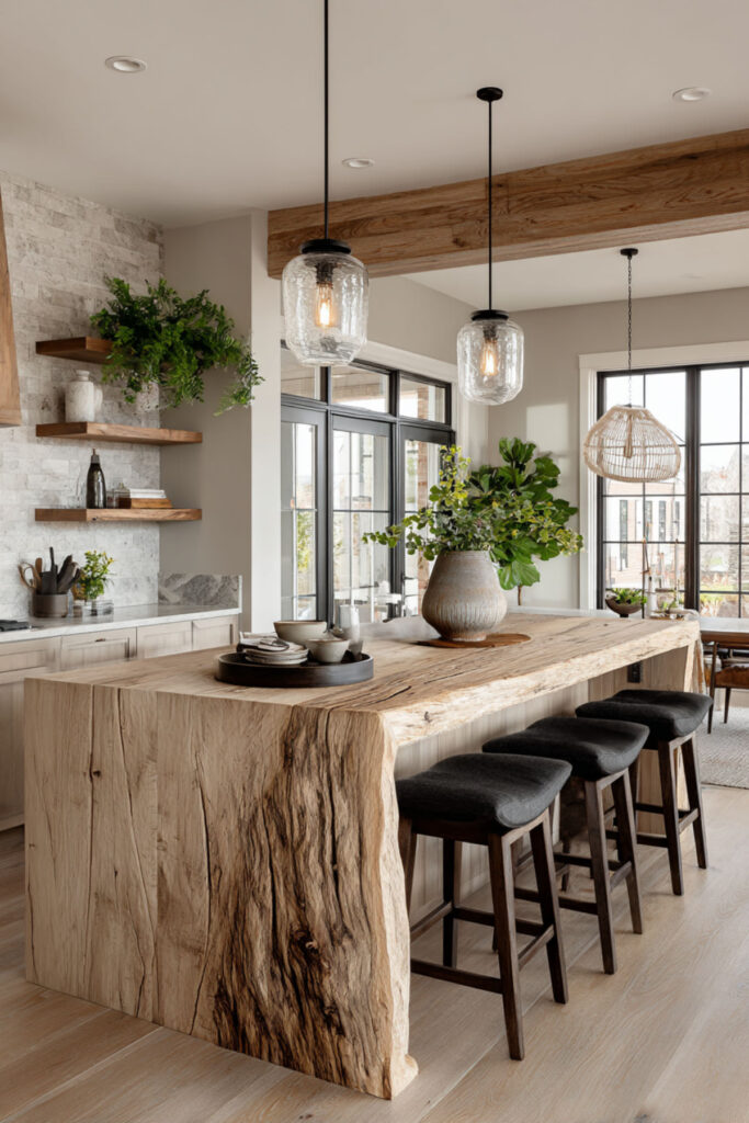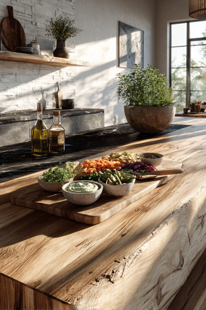 For kitchens with a more organic, natural vibe, a live edge detail on one side of the butcher block island adds a raw, beautiful element that no machine can replicate. The natural edge of the wood — with its curves and bark remnants — brings the outdoors in and makes the island feel like a genuine piece of nature rather than a manufactured surface. Okay, I know the live edge can feel polarizing — some people love it, some think it’s too rustic. I think when it’s done with restraint (live edge on one side, clean edge on the working side), it’s absolutely stunning. I’d recommend a live-edge walnut or maple slab for the island with a food-safe oil finish — the natural oils bring out the grain beautifully.