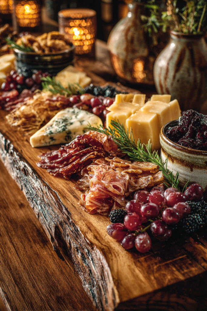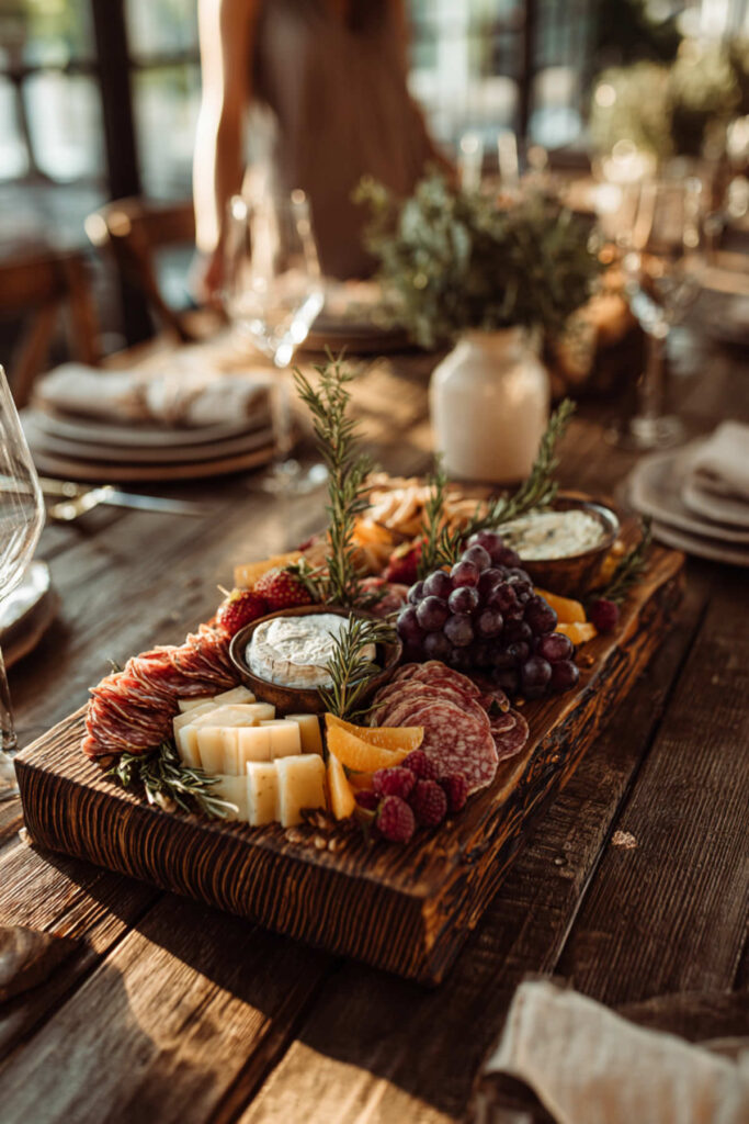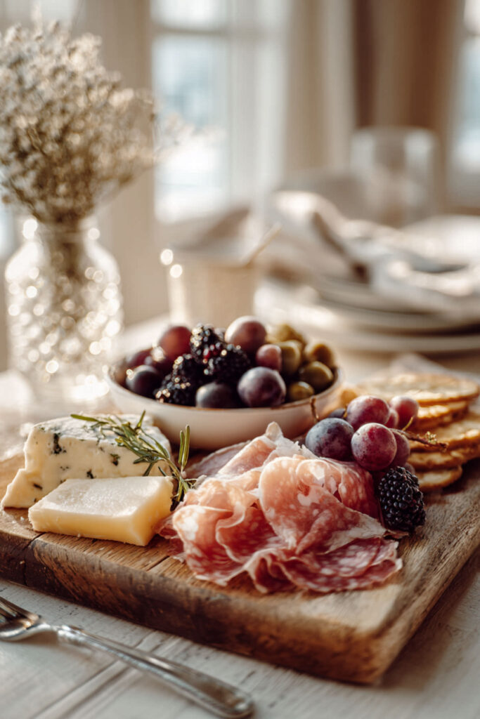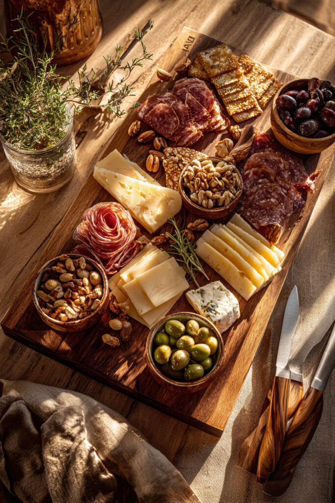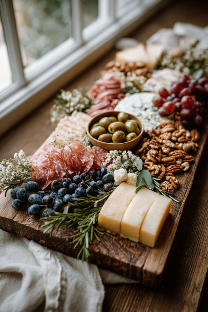 Here’s a truth that experienced hosts know: the most impressive-looking boards aren’t always the most expensive. A charcuterie board on a budget uses fewer premium ingredients, but arranges them with intention. One good cheese instead of three, a block of salami sliced at home, seasonal fruit from the farmers market, a homemade honey-rosemary dip, and a few handfuls of nuts and dried fruit. The visual abundance comes from how you arrange, not how much you spend. I recommend buying one splurge item — a beautiful wedge of brie or a jar of imported fig preserves — and letting everything else be simple, seasonal, and inexpensive. Fan the salami into rosettes, scatter the fruit strategically, tuck in some fresh rosemary sprigs for color. This budget charcuterie board approach proves that elegance is a skill, not a price tag.