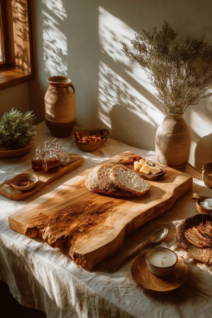 The board itself matters just as much as what’s on it. A beautiful wooden charcuterie board in walnut, olive wood, or acacia becomes a serving piece and a design statement at the same time. The natural grain, the warm tones, the way the wood patinas with use — it turns a simple spread into something that looks crafted and intentional. I recommend a thick-cut walnut board with a live edge for maximum visual impact. The natural edge becomes part of the presentation — organic, a little imperfect, and completely stunning. A board like this can double as kitchen decor when it’s not in use, propped against the backsplash with a few other wooden pieces. These wood boards for charcuterie are the kind of investment that makes every gathering feel more elevated.