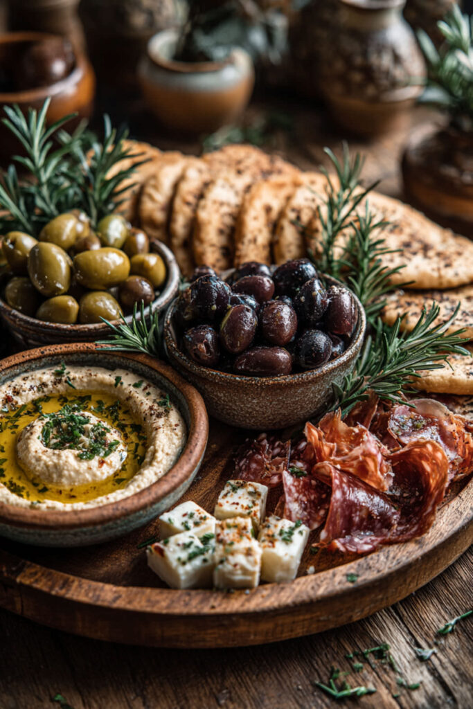 Mediterranean Charcuterie Board With Olives, Hummus, and Flatbread