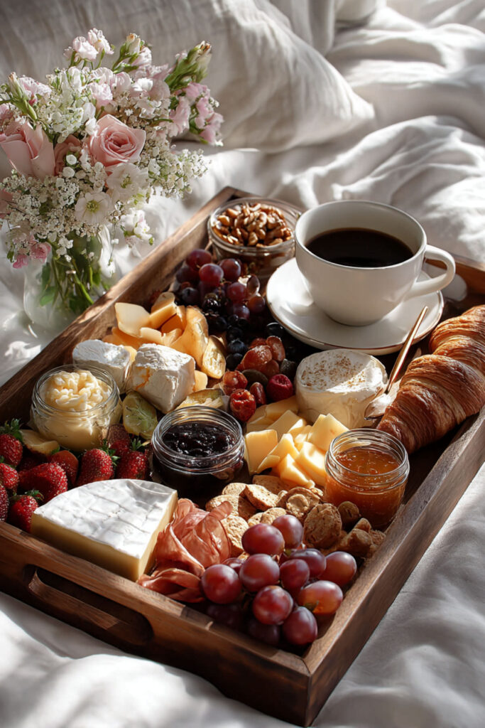 Brunch and charcuterie were made for each other. A charcuterie boards brunch spread replaces the traditional meats with breakfast proteins — smoked salmon, prosciutto, crispy bacon — and adds soft cheeses, fresh fruit, mini croissants, honeycomb, granola clusters, and a few ramekins of preserves. It’s the kind of brunch spread that makes everyone feel like they’re at a boutique hotel instead of your kitchen. I recommend arranging the board the night before minus the fresh fruit and warm items, then adding those in the morning. A wooden board with a linen napkin draped alongside, a few fresh flowers in a small vase nearby, and the table looks like a styled editorial. This breakfast charcuterie board approach turns a simple weekend morning into something genuinely memorable.