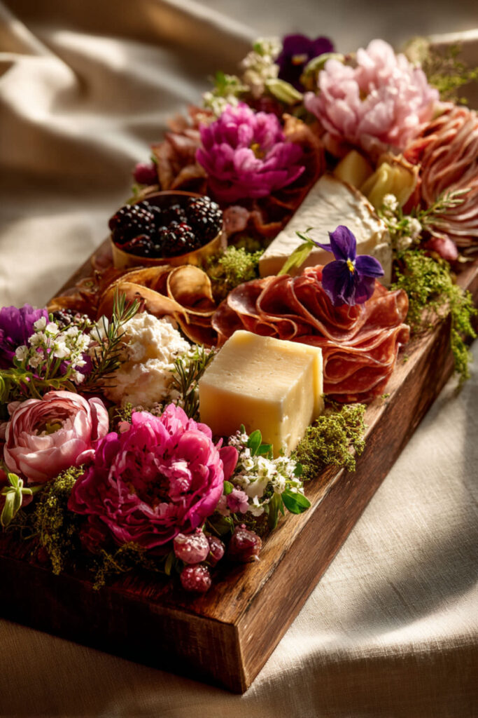 Adding edible or decorative flowers to a charcuterie board instantly elevates it from appetizer to centerpiece. Small clusters of fresh herbs (rosemary, thyme, sage), edible flowers (nasturtiums, pansies, violets), or even a few small fresh-cut blooms tucked around the edges transform the board into something that looks like it belongs in a styled photoshoot. I recommend edible flowers specifically — nasturtiums add a peppery flavor and gorgeous orange-and-red color, while pansies add soft purples and yellows. Place them in small clusters at the corners and edges of the board. These charcuterie boards with flowers are the kind of detail that makes guests pull out their phones — in the best possible way.