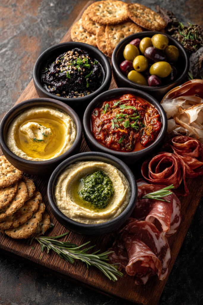 Dips turn a charcuterie board from a display into an experience. When guests can scoop, dip, and build their own bites, the board becomes interactive — and interactive food is always the most popular at a party. A charcuterie board with dips spread might include whipped ricotta with honey, a roasted garlic and white bean dip, a classic olive tapenade, and a warm baked brie with fig jam. I recommend placing three or four small ceramic bowls or ramekins directly on the board, spaced evenly. Surround each dip with its ideal dipping vehicle — crostini for the ricotta, crackers for the tapenade, sliced baguette for the brie. These dips board ideas turn passive snacking into active, joyful eating — which is exactly the energy you want at an elegant gathering.