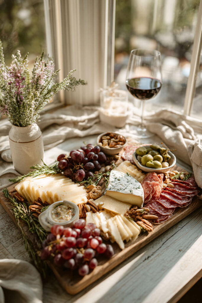 A Mediterranean-inspired board leans into warmer, brighter flavors — marinated olives, hummus, roasted red peppers, stuffed grape leaves, pita chips, flatbread, feta drizzled with olive oil, and sun-dried tomatoes. The color palette alone is gorgeous: deep reds, bright greens, warm golds. It feels like summer even in February. I recommend a large round olive wood board and several small ceramic bowls for the dips and spreads. The Mediterranean charcuterie board is perfect for women who want to serve something a little different from the standard meat-and-cheese setup. It’s healthier, more colorful, and endlessly adaptable — add some lamb meatballs or grilled halloumi and it becomes a full meal. Like those incredible mezze spreads you’d find at a rooftop dinner party in the West Village.