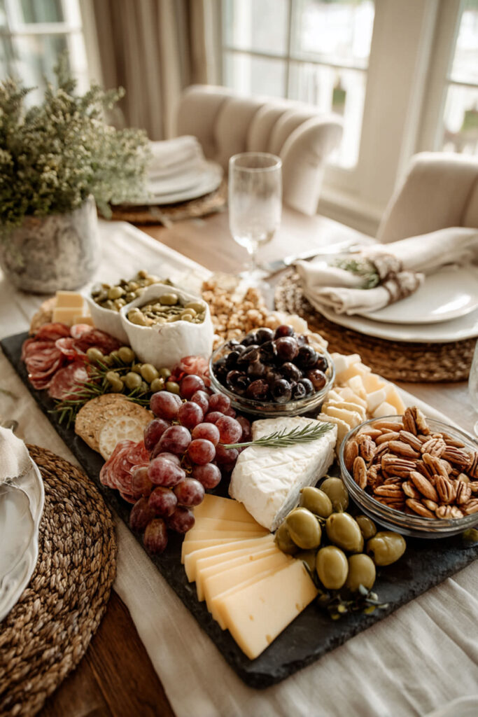 Let’s close with the ultimate hosting move: a table-length charcuterie spread. Instead of a single board, cover the entire table — or a long section of it — with parchment paper, and build the spread directly on the surface. Cheeses placed every two feet, meats fanned between them, clusters of fruit, bowls of dips, breadsticks standing upright in jars, flowers tucked between sections. The table itself becomes the board, and the effect is jaw-dropping. I recommend planning zones: a meat-and-cheese section, a fruit-and-sweets section, a dips-and-bread section, and a nuts-and-dried-fruit section. Distribute the colors evenly so no single area is all one tone. Fresh herbs and edible flowers fill the gaps. Would you try a table-length spread? I think for women who host with intention and love making people feel welcome, this is the move that turns a gathering into an event — the kind of evening guests talk about for months.