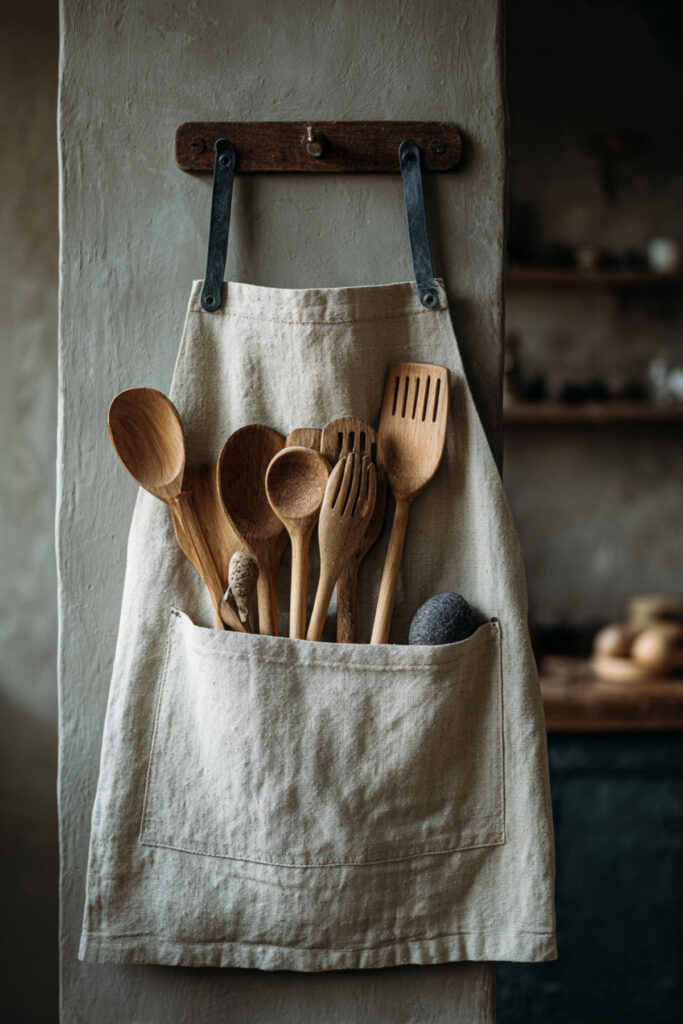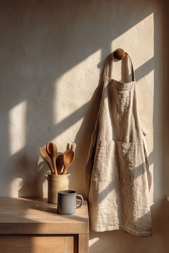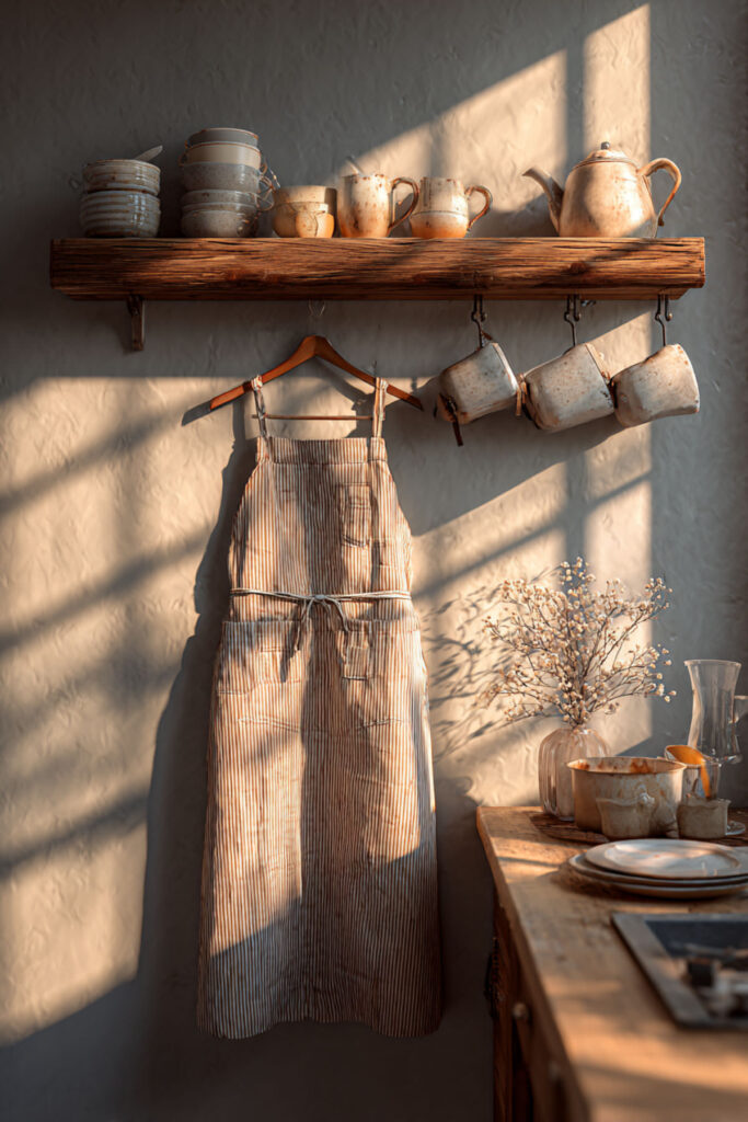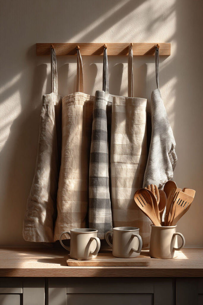 Here’s an idea that costs nothing extra but adds a gorgeous detail to your kitchen: hang your apron on a beautiful brass or wooden hook on the wall when you’re not wearing it. A vintage apron or a linen cross-back draped from a single peg near the stove becomes a piece of kitchen decor — a visual reminder that cooking happens here, that someone cares about this space, that this room is for making things. I recommend a brass or natural wood peg hook mounted at shoulder height near your cooking area — just one hook, with your most beautiful apron hanging from it. The fabric drapes and folds naturally, adding texture and warmth to the wall. This approach is especially gorgeous in kitchens with open shelving and minimal decor, where every visible object earns its place. A beautiful apron on a hook says more about your kitchen aesthetic than any art print ever could.