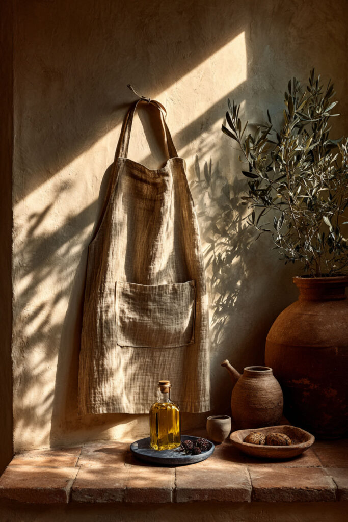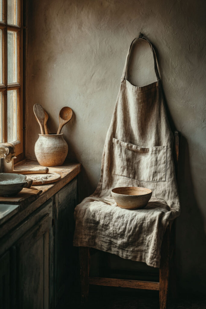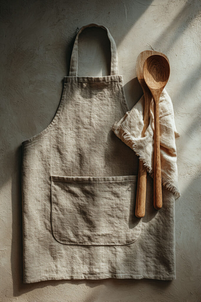 Here’s something that might seem extra but genuinely makes a difference: choosing an apron that matches your kitchen’s color palette. If your kitchen is sage green and cream, a natural linen apron ties you visually into the space. If your kitchen is moody and dark, a charcoal or indigo apron feels cohesive. When you match your apron to your kitchen, the whole scene — you included — looks like it was designed together. I recommend thinking about your kitchen’s two or three main tones and choosing an apron in one of them. It doesn’t need to be exact — just in the same family. The kitchen apron aesthetic isn’t about performing for anyone else. It’s about creating a moment where you look around your kitchen, look down at what you’re wearing, and everything feels right. That coherence is deeply calming. And calm is the whole foundation of cooking as self-care.