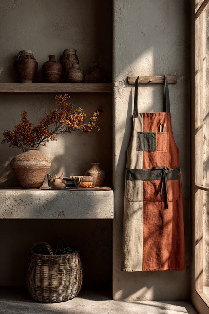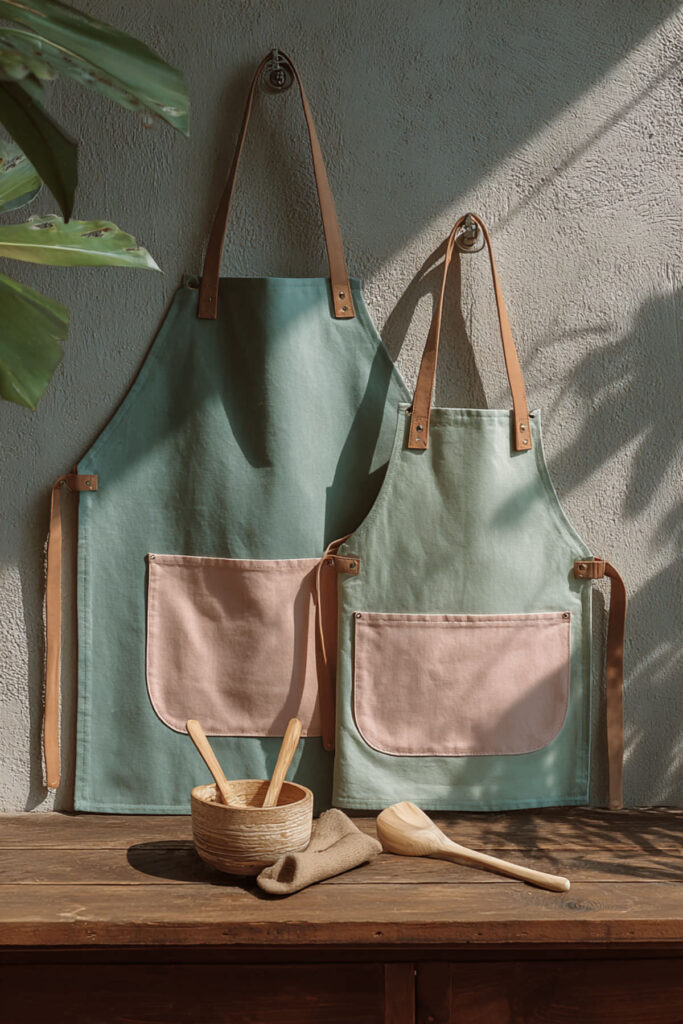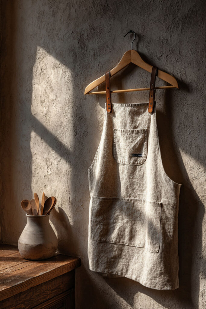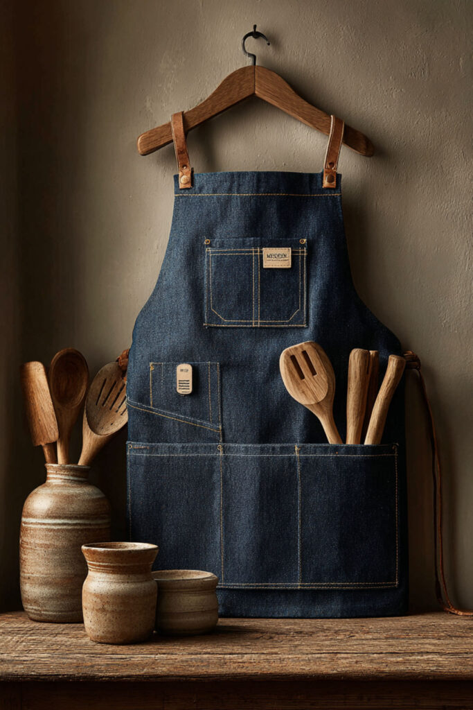 Denim in the kitchen might sound surprising, but a denim kitchen apron has a weight and structure that feels genuinely substantial — like putting on armor for a creative battle (the good kind). The fabric is tough, hides stains beautifully, and develops a personalized fade over time that makes it look more characterful the more you cook in it. I recommend a medium-weight denim apron in an indigo or washed blue with leather or canvas adjustable straps and copper or brass hardware on the adjustment points. The metal details add a craftsman quality that makes the apron feel like a tool, not just a covering. This denim kitchen apron approach has been gaining traction in artisan bakeries and ceramics studios, and it translates perfectly into a home kitchen where cooking is treated as a craft. Some people think denim aprons are too heavy — I think the weight is part of the ritual. It feels like suiting up for something that matters.