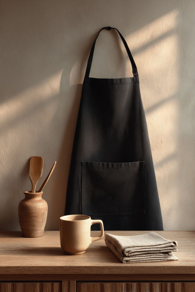 For women whose self-care kitchen leans modern and minimal, a clean, simple apron in matte black or charcoal is the move. No pattern, no frills, no visual noise — just a well-cut piece of fabric that lets you focus on the cooking itself. The minimalist apron is the little black dress of kitchen wear: it goes with everything and makes you feel put-together without trying. I recommend a minimalist cotton or cotton-canvas apron in matte black with a clean bib, slim adjustable straps, and one or two understated front pockets. The lack of embellishment is the whole point — the apron stays in the background while you and the food take center stage. This minimalist kitchen apron style is especially beautiful in neutral kitchens — cream cabinets, marble counters, warm wood — where the black apron becomes a quiet, intentional contrast. It’s the apron for women who find calm in simplicity.