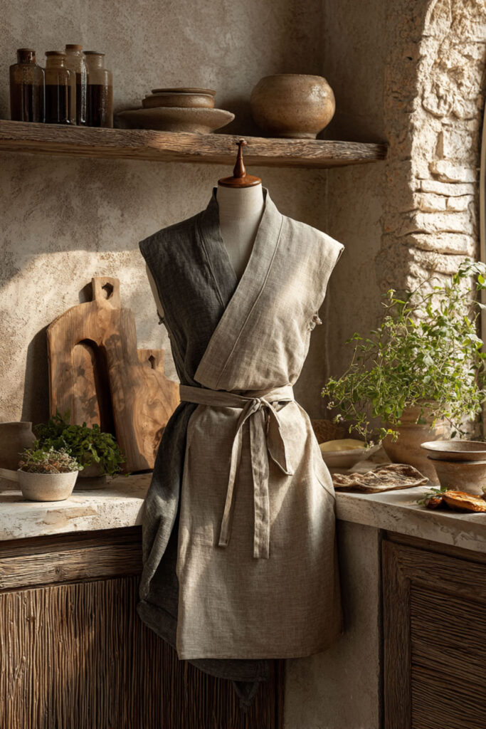 Okay, I used to think a wrap-around apron sounded complicated. But I’ve totally changed my mind. A Japanese-style kitchen apron — sometimes called a smock or tabard — wraps around the body and ties at the waist or back, providing more coverage than a standard bib apron while looking incredibly elegant. The design originated in Japanese artisan workshops and has this beautiful, architectural quality that makes it feel more like a garment than a cooking accessory. I recommend a linen or cotton-blend Japanese wrap apron in an earth tone — warm gray, sand, or indigo — with a relaxed fit and a single chest pocket. The wrap creates a clean silhouette that looks amazing from every angle, and the coverage means you’re protected from splashes on the sides too. This style has been embraced by potters, bakers, and home cooks in the slow living community, and it’s easy to see why — it transforms “wearing an apron” into “putting on something beautiful.” That shift in feeling? That’s self-care in fabric form.