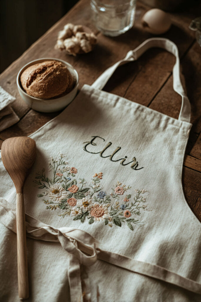 A personalized kitchen apron — embroidered with your name, initials, or a short phrase — turns a functional item into something that feels yours in a way nothing else in the kitchen quite does. It’s like monogramming a towel or engraving a ring: it says this was chosen specifically for this person. I recommend a personalized apron in natural linen or soft cotton with a hand-embroidered name in a simple, modern font. Warm thread colors — gold, terracotta, sage — on a neutral base look especially beautiful. This makes an incredible gift for a friend who loves cooking, but honestly, the best version is the one you get for yourself. Because the whole point of a self-care kitchen is that it’s for you. A personalized kitchen apron hanging on a brass hook near the stove is a daily reminder: this space, this ritual, this time — it’s mine. And that matters more than any recipe.