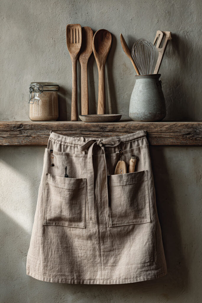 A soft cotton apron in cream, warm gray, or dusty rose is the workhorse of the self-care kitchen. Cotton is easy to wash, durable, and comfortable from the very first wear (no break-in period like linen). It’s the fabric that says: I’m here to cook, I’m going to be comfortable, and I’m not worried about a few flour smudges. I recommend a medium-weight cotton apron with a bib front, adjustable neck strap, and long waist ties that wrap and tie in the front. Front pockets are non-negotiable — you’ll use them for your phone, a kitchen timer, a spoon rest, or just to dry your hands without reaching for a towel. This cotton apron style reminds me of those effortlessly cozy cooking sessions you see on baking accounts from women in cottage kitchens outside of Portland, Oregon — relaxed, warm, and completely unhurried. That’s the vibe.