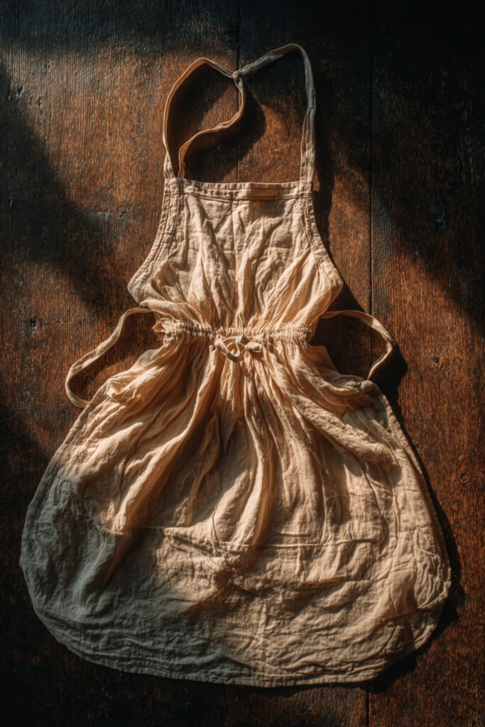 Flour sack fabric — that thin, soft, slightly slubby cotton that’s been used in American kitchens for over a century — makes a surprisingly gorgeous apron. It’s lightweight, breathable, and has this homespun quality that makes you feel like you’re cooking in a farmhouse kitchen even if you’re in a condo. It’s also incredibly absorbent, which means it doubles as a surface to quickly dry your hands. I recommend a flour sack cotton apron in natural white or off-white with a simple cross-back or tie-back design. The fabric is thin enough to feel barely there but strong enough to handle daily wear and washing. It wrinkles naturally — which is part of the charm. This soft fabric apron style pairs beautifully with flour sack towels hung on a nearby hook, creating a coordinated, old-fashioned look that feels warm and intentional. There’s a reason flour sack fabric has survived every kitchen trend for a hundred years: it’s honest, comfortable, and always appropriate. Kind of like the best self-care rituals.