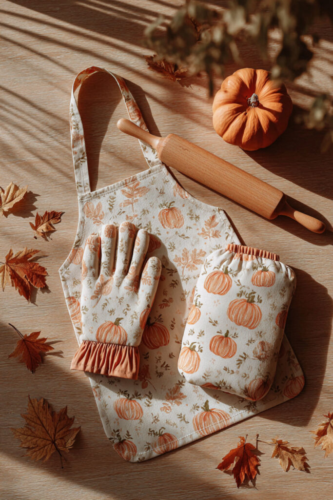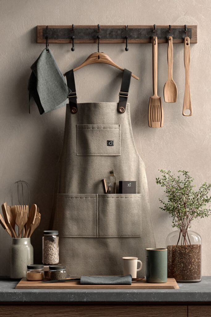 Next up — a fun idea for anyone who likes to refresh their kitchen’s mood seasonally. A trendy kitchen apron in a seasonal color — dusty rose for spring, warm linen for summer, burnt sienna for fall, deep forest green for winter — lets you mark the passage of time with a simple swap. When you change the apron, you change how the kitchen feels. I recommend building a small collection of two or three aprons in different seasonal tones — all in the same style (cross-back or tie-back) so the silhouette stays consistent while the color shifts. Hang the current season’s apron on the hook and store the others in a drawer. This approach treats the apron like a piece of the kitchen’s wardrobe, which is exactly what it is. It’s a tiny, joyful act of refreshing your space — and in a self-care kitchen, those tiny acts accumulate into something that genuinely changes how your daily life feels.
