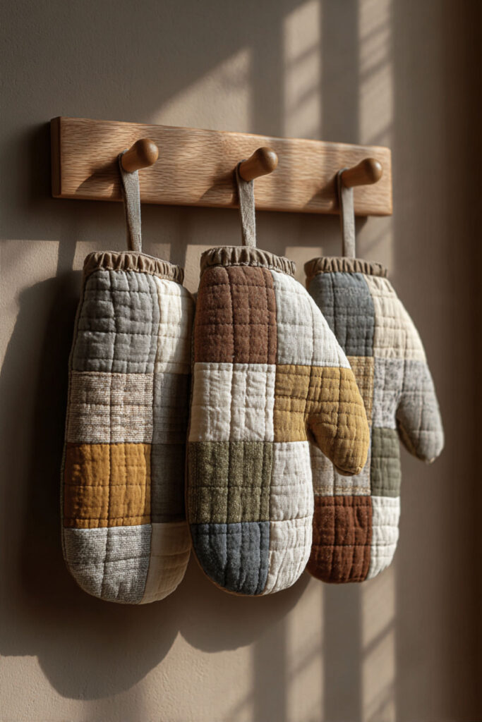 For kitchens that celebrate a handmade, layered aesthetic, patchwork oven mitts — made from multiple fabric scraps stitched together — add a one-of-a-kind character that no solid-color mitt can match. Each panel is different, creating a quilt-like effect that feels warm, personal, and perfectly imperfect. I recommend patchwork cotton mitts in a coordinated color palette — warm neutrals, soft earth tones, or a mix of calico prints in muted shades. The patches should harmonize rather than clash, creating a curated-not-chaotic look. These patchwork oven mitts are especially gorgeous in cottage-style and farmhouse kitchens, where they feel like part of the home’s story. Some people think patchwork looks messy — I think it’s one of the most charming things you can add to a kitchen.