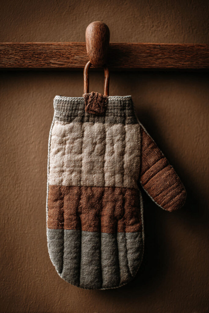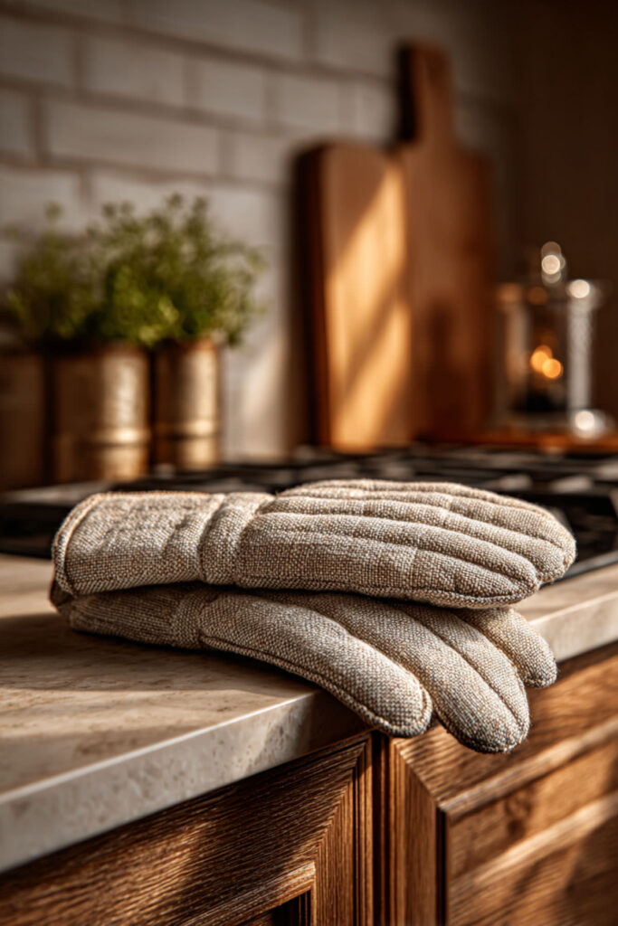 Linen oven mitts have that gorgeous, natural drape and texture that makes them look stunning even when they’re just hanging on a hook. The fabric is breathable, gets softer with every wash, and has an organic quality that pairs beautifully with farmhouse, cottage, and earthy kitchen styles. I recommend a linen oven mitt with a quilted cotton interior for insulation — the linen exterior handles moderate heat well, and the cotton inside provides the protection you need for standard baking temperatures. Colors like natural flax, warm gray, or soft sage keep it neutral and versatile. These rustic oven mitts work especially well in kitchens with open shelving, warm wood surfaces, and natural textiles. They don’t look like safety equipment — they look like a deliberate design choice.