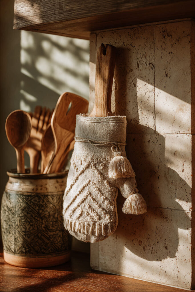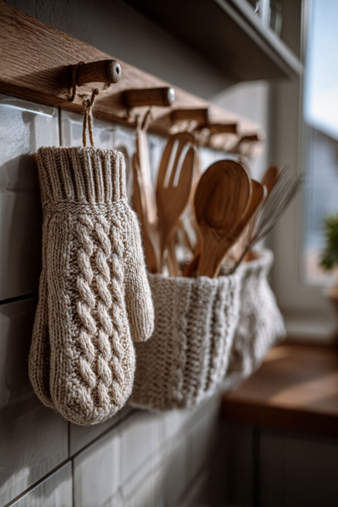 And here’s the best part — a beautiful pair of oven mitts hanging on brass or wooden hooks near the stove is one of the simplest, most effective pieces of kitchen decor you can create. The mitts are always visible, always accessible, and always adding warmth and color to the room. No more digging through a drawer mid-bake. No more burning yourself because you couldn’t find them in time. I recommend two brass or natural wood peg hooks mounted at shoulder height on the wall beside or near the oven, with your prettiest pair of mitts hanging side by side. Add a matching pot holder below or a linen dish towel on a nearby hook and you’ve got a styled baking corner that’s both gorgeous and functional. This is the kind of detail that makes a kitchen feel like it was designed by someone who actually bakes — not just someone who buys pretty things. The mitts are proof of use, proof of care, and that safe and stylish aren’t competing priorities. They’re the same thing.