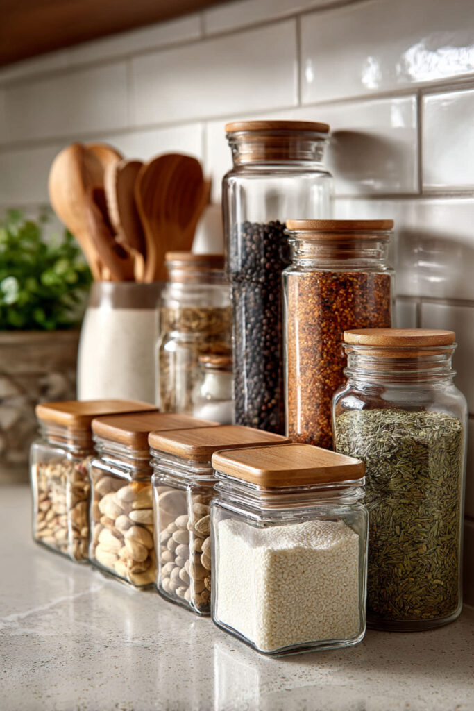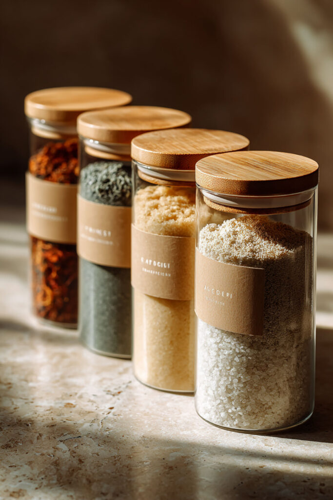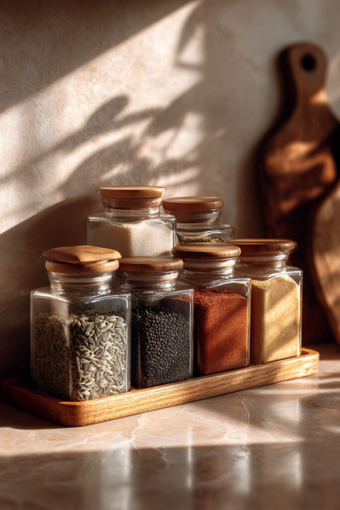Here’s a take that might surprise you: you don’t always need a perfectly matching set. A carefully curated variety of spice jars on the countertop — two amber jars for your everyday blends, a ceramic crock for sea salt, a glass jar with a bamboo lid for peppercorns, and a tiny vintage bottle for saffron — can look just as intentional as a uniform set, as long as the tones and textures relate to each other. I recommend keeping your variety within one color family — warm neutrals, for example, or earth tones — and displaying them on a shared tray or cutting board so they read as a group rather than random items. The key is that each jar looks like it was chosen, not grabbed. This curated-mix approach feels more like a real kitchen than a catalog shoot, and that’s exactly the kind of countertop aesthetic that resonates with women who value both beauty and authenticity. It’s organized. It’s warm. And it’s very, very you.