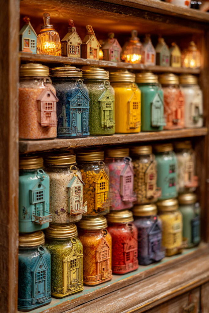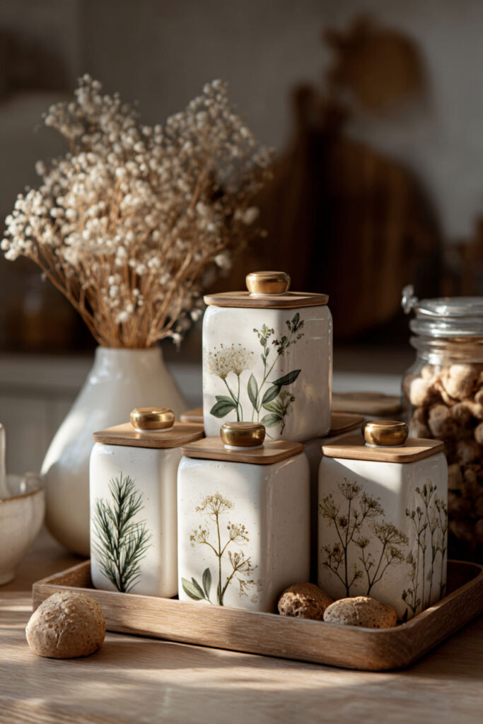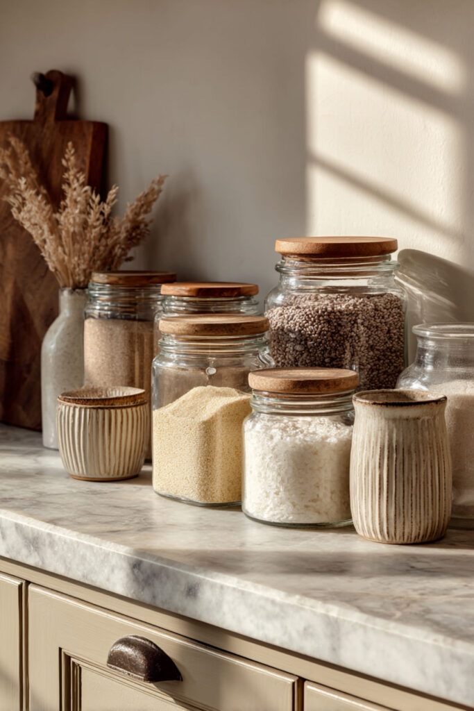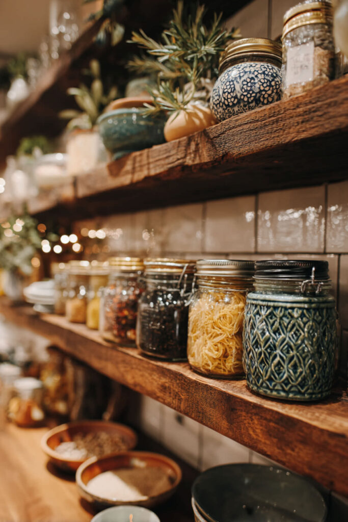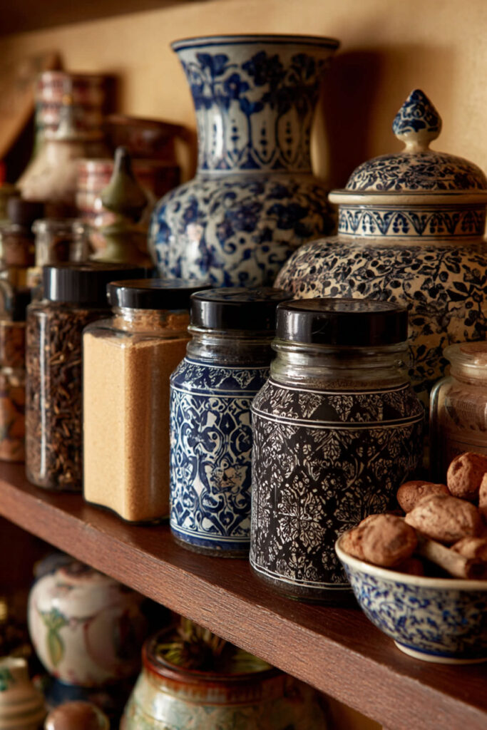 Not every spice jar needs to be purely functional. A few beautiful, decorative spice jars placed on open shelving alongside your stoneware and cookbooks become part of the kitchen’s visual story. Think hand-painted ceramic jars, colored glass canisters, or textured pottery pieces that hold your most-used spices while doubling as art. I recommend choosing two or three decorative jars in materials that complement your kitchen’s palette — cream stoneware for neutral kitchens, amber glass for warm-toned spaces, soft blue ceramics for coastal kitchens — and placing them on your open shelving between a cookbook and a small vase. The spices inside are accessible, but the jar itself is a design object. These decorative spice jars bridge the gap between organization and styling, which is exactly what an aesthetic kitchen is all about: everything has a purpose, and everything is beautiful.