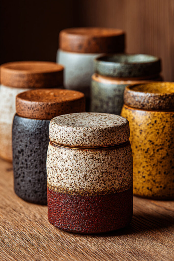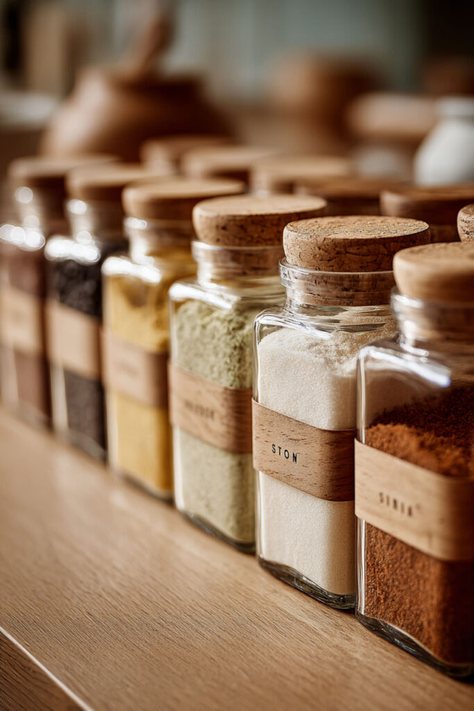 Okay, I used to think all spice jars needed to be clear so you could see inside. But I’ve totally changed my mind after seeing stoneware spice jars in action. Handmade stoneware jars — in warm cream, soft gray, or muted earth tones — add a layer of texture and warmth that glass simply can’t achieve. Each jar has slight variations in color and finish, which makes the set feel collected rather than catalog-ordered. I recommend a set of stoneware spice jars with cork or wooden lids and simple embossed or hand-lettered labels. The tactile quality of picking up a handmade jar while you cook adds something to the experience that’s hard to put into words — it just feels different. More intentional. More connected to the process. These stoneware spice jars are especially gorgeous in kitchens with cream cabinets, natural wood shelving, and warm brass hardware. They make your spice collection feel like an extension of the kitchen’s design rather than an afterthought.