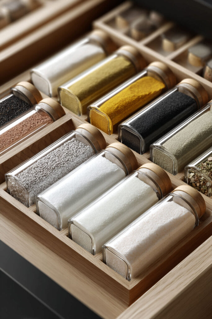 If you’re a drawer person (and I think more people should be), matching spice jars organized label-side-up in a dedicated drawer is one of the most satisfying kitchen setups you can create. You open the drawer, and every single spice is visible at a glance — no reaching, no searching, no knocking over three bottles to find the one in the back. I recommend square glass jars — they fit flush against each other with zero wasted space — with a set of matching printed labels and a non-slip drawer liner. The key is that the jars need to be the right height for your drawer (around 4 inches for most standard kitchen drawers) so they sit below the drawer edge and don’t catch when you open it. This matching spice jars drawer system is the kind of kitchen organization that actually changes your daily routine. When everything is visible and within reach, cooking becomes faster, calmer, and more enjoyable. That’s not a small thing.