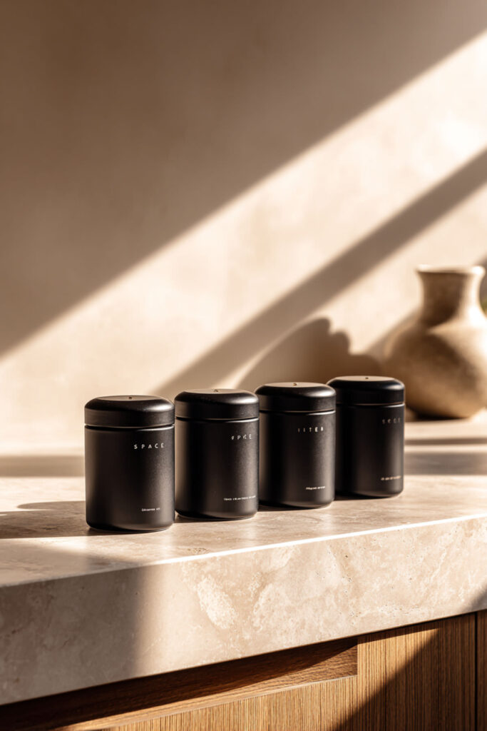 Matte black spice jars are having a moment, and I completely understand why. Against a light countertop — marble, quartz, cream, or white — a row of matte black canisters creates this striking, gallery-like contrast that makes the spice display feel like a design statement. The dark finish hides residue and fingerprints, and the modern silhouette feels clean and intentional. I recommend a set of matte black metal or ceramic spice tins with clear windowed lids (so you can still see the contents) and white printed labels. The black-and-white contrast is sharp, modern, and incredibly photogenic. This modern spice jars approach is especially effective in kitchens with matte black hardware, black faucets, or dark accents — it ties the whole aesthetic together. It’s the kind of counter display that looks like it was styled for a photo shoot but actually gets used every single day.