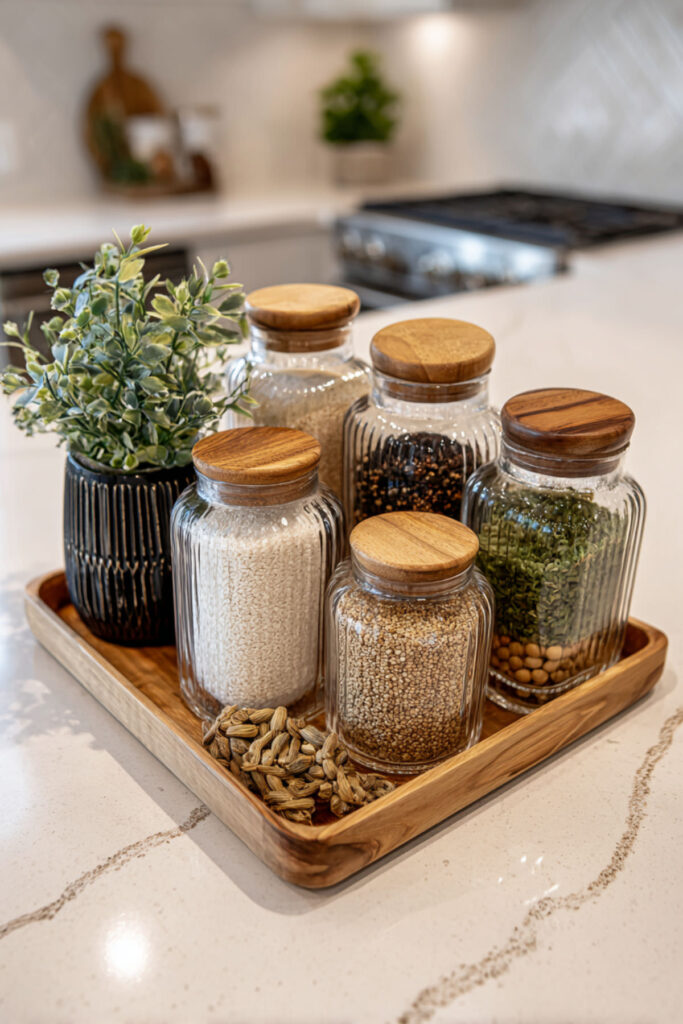 Here’s the simplest trick for making any spice collection look intentional: put it on a tray. An assorted collection of spice jars on a tray — whether it’s a round wooden tray, a brass oval tray, or a rectangular marble tray — instantly goes from scattered to styled. The tray creates a visual boundary that tells your eye, “This is a curated group, not countertop clutter.” I recommend a natural wood or brass tray large enough to hold your eight to ten most-used spice jars, plus a small olive oil bottle and a salt cellar. The tray corrals everything into one moment on the counter — one beautiful, organized, reachable moment. This assorted spice jars on tray setup is one of the most-pinned kitchen styling ideas for a reason: it takes thirty seconds to arrange and makes your counter look like it belongs in a cooking magazine. That’s a return on investment you can’t beat.