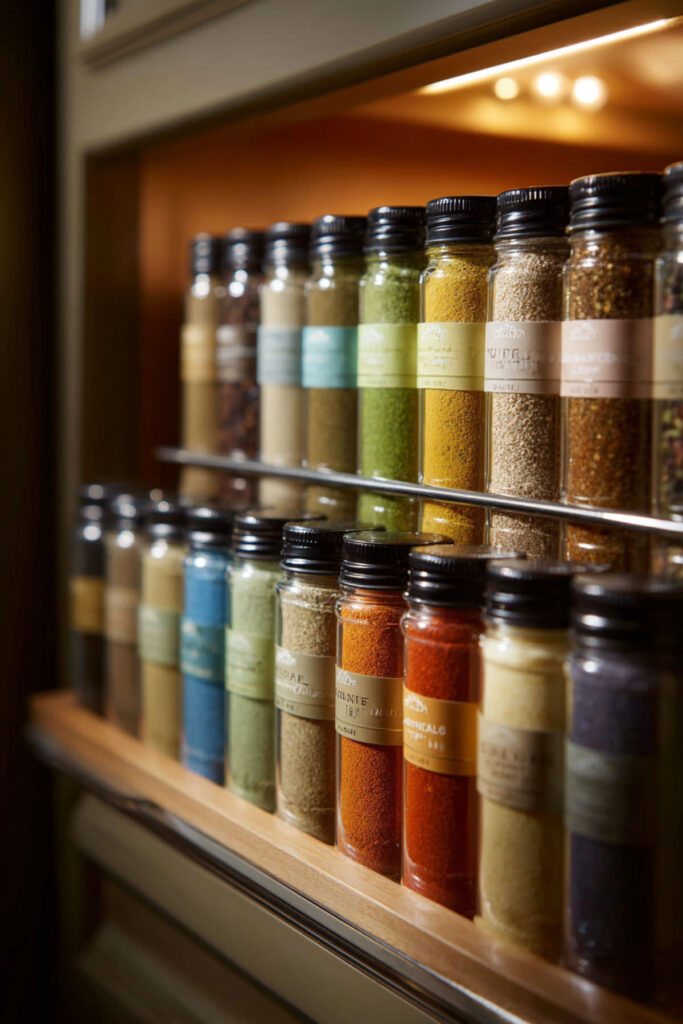For anyone who prefers a clean, clutter-free counter with absolutely nothing on it, a pull-out spice rack inside a narrow cabinet is the ultimate solution. These slim, vertical racks slide out from between cabinets and hold twenty to thirty jars in tiered rows that are all visible at once. When you push it back in, the spices completely disappear. I recommend a narrow pull-out rack system with tiered shelves designed for standard 4-ounce jars, installed in a 3–6 inch gap between cabinets that would otherwise go unused. It’s one of the smartest uses of dead space in a kitchen, and it creates a hidden spice jars organization system that keeps your counters perfectly clear. This is the approach that professional kitchen organizers swear by, because it combines maximum capacity with minimal visual footprint. If you’re the kind of person who finds peace in a completely clear countertop, this is your answer.