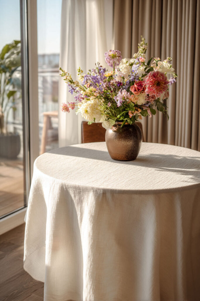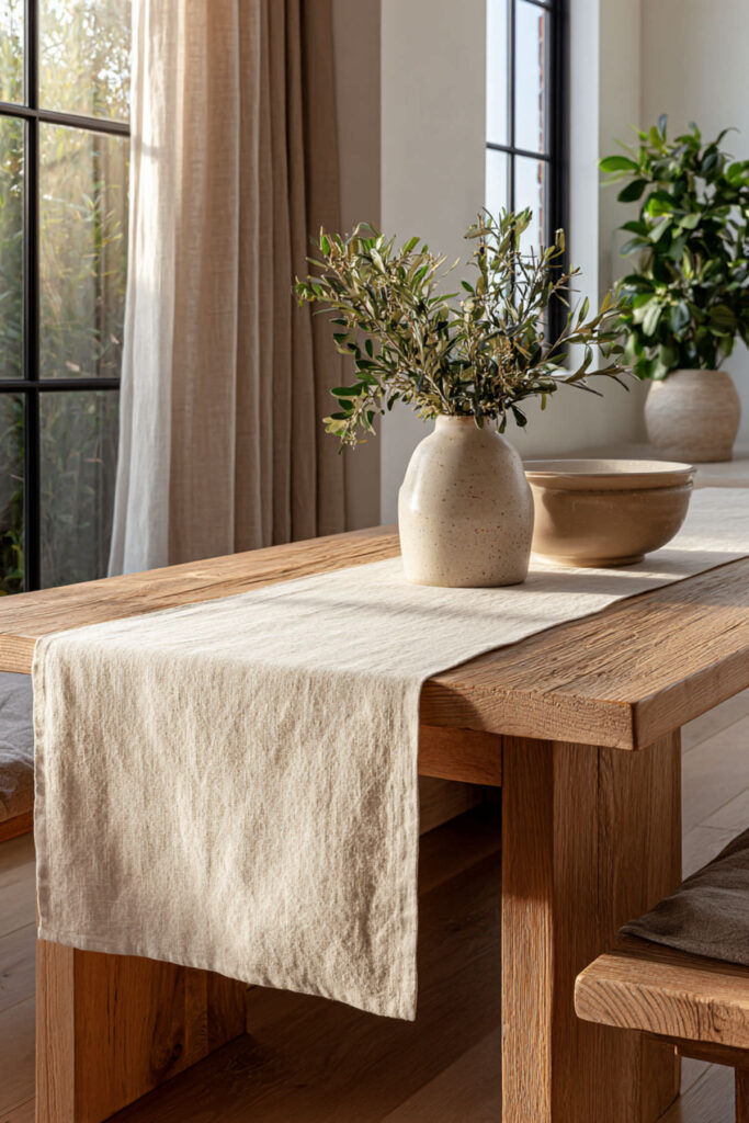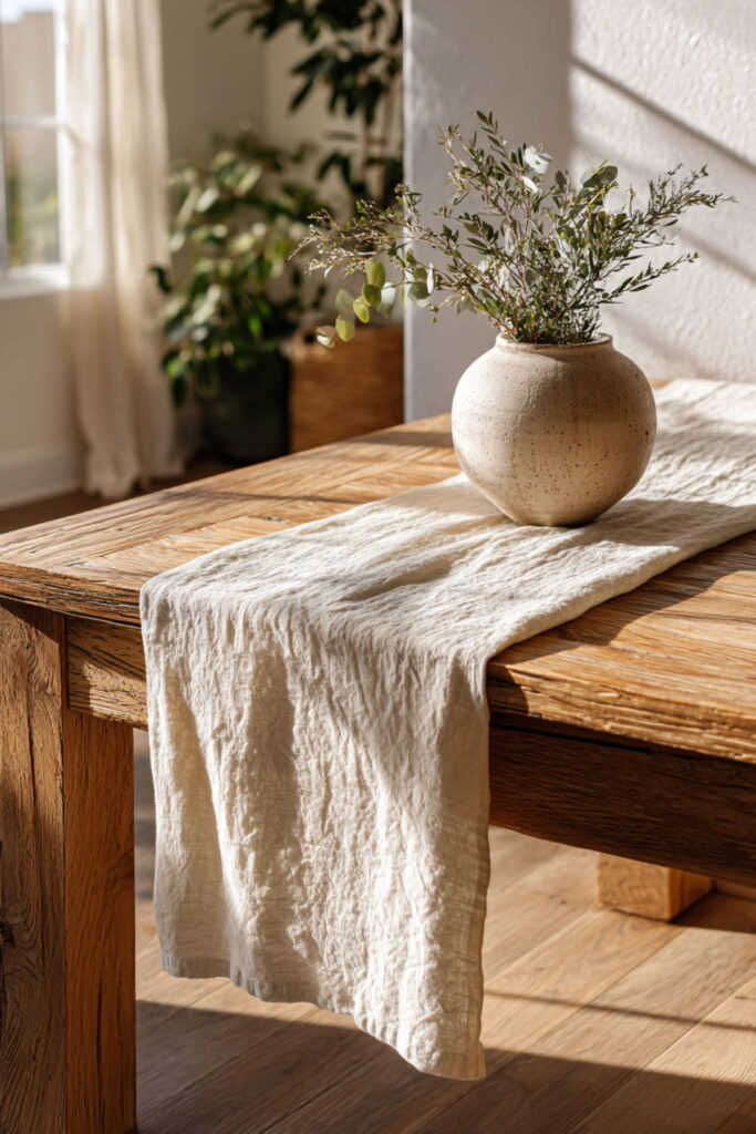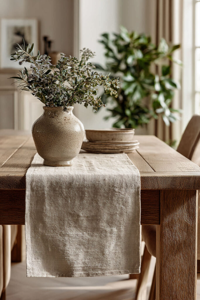 I really recommend a washed linen runner in a neutral tone — oatmeal, flax, warm white, or soft gray. The pre-washed finish means it already has that relaxed texture from day one. Lay it down the center of your dining table, let the ends hang about six inches over each side, and you’re done. A linen table runner works with every style — farmhouse, modern, Scandinavian, you name it. It’s one of those pieces that feels like it’s always been there, and that’s the highest compliment a table runner can get.
